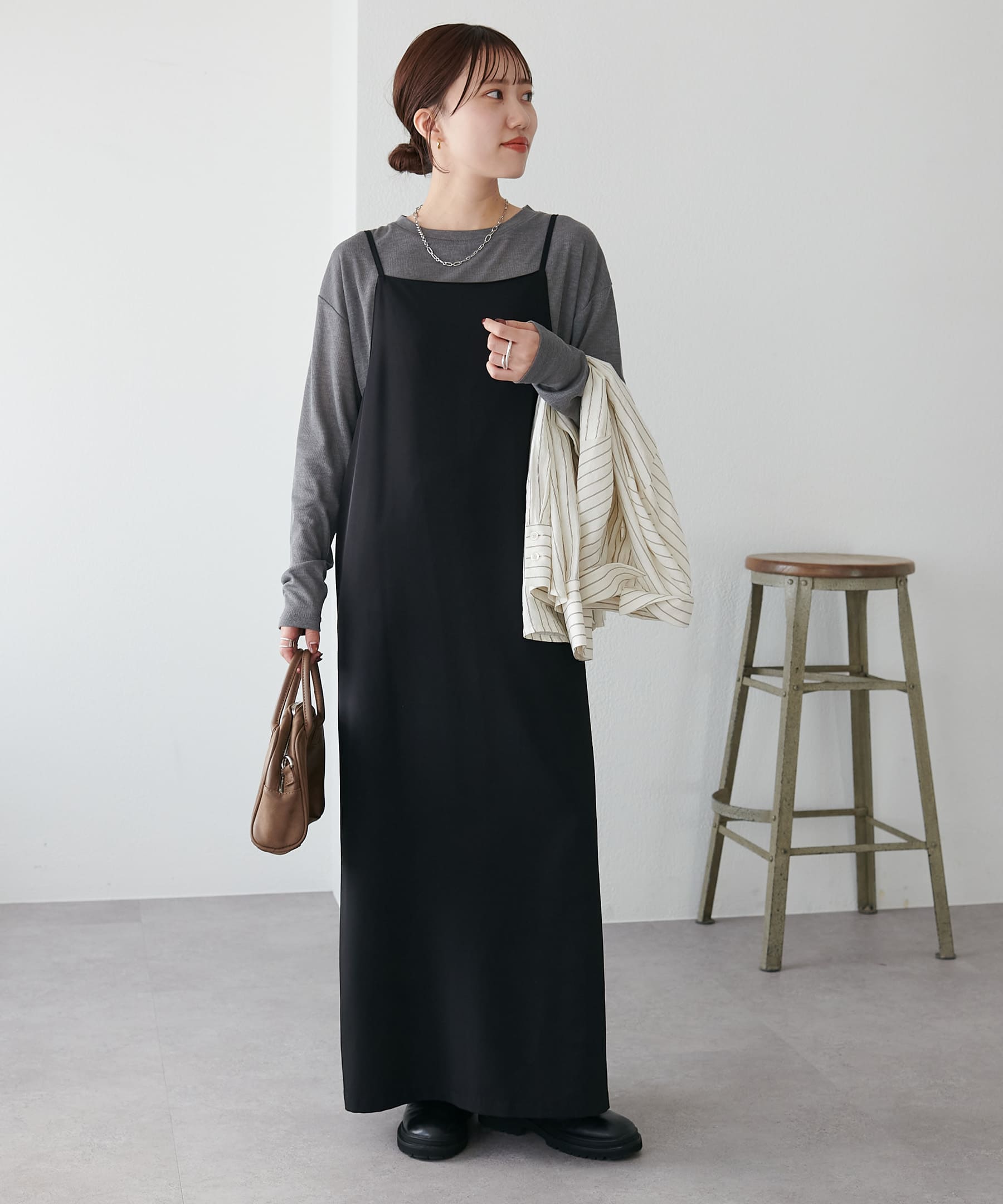締め色のグレーのカットソーがセットに。