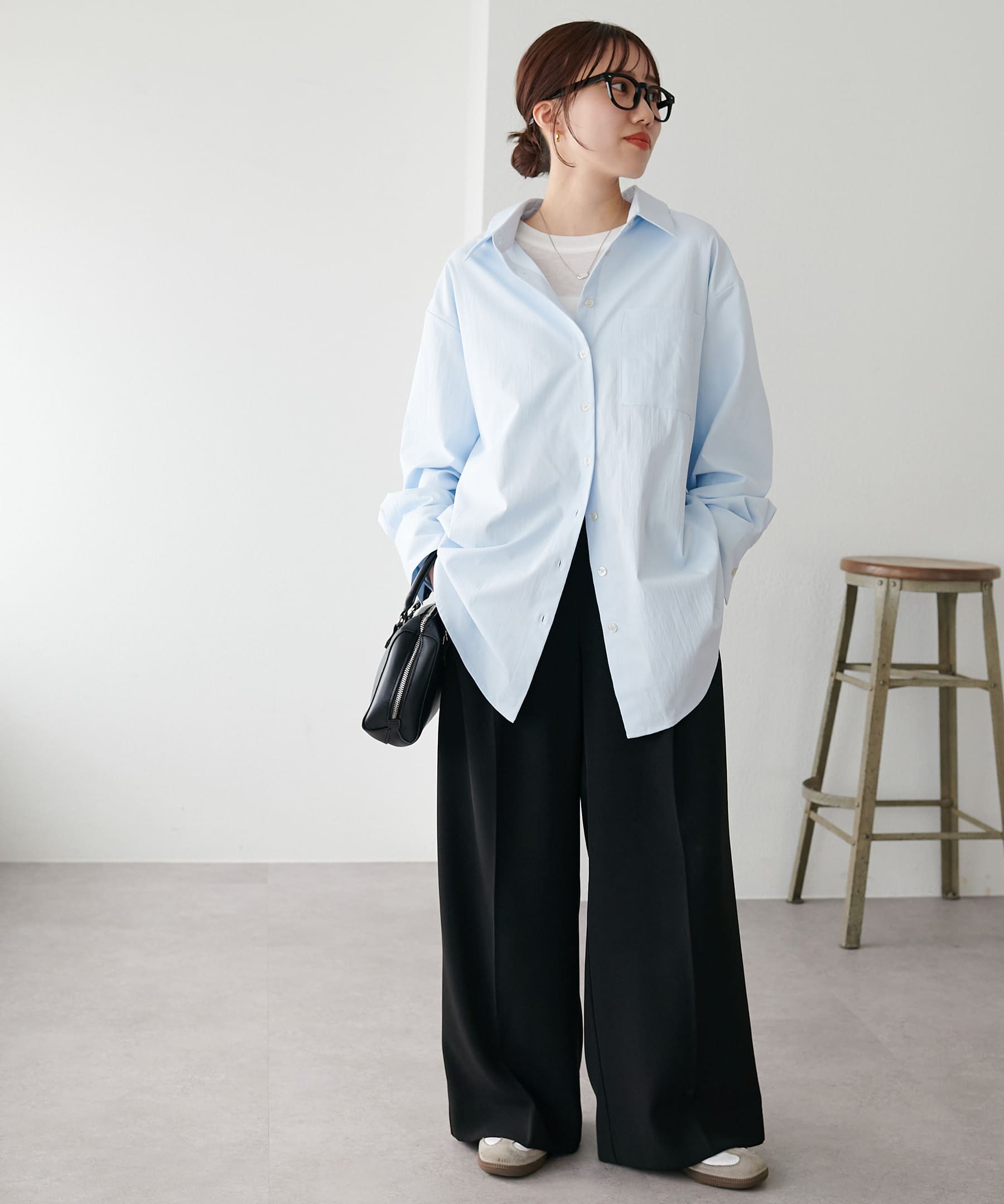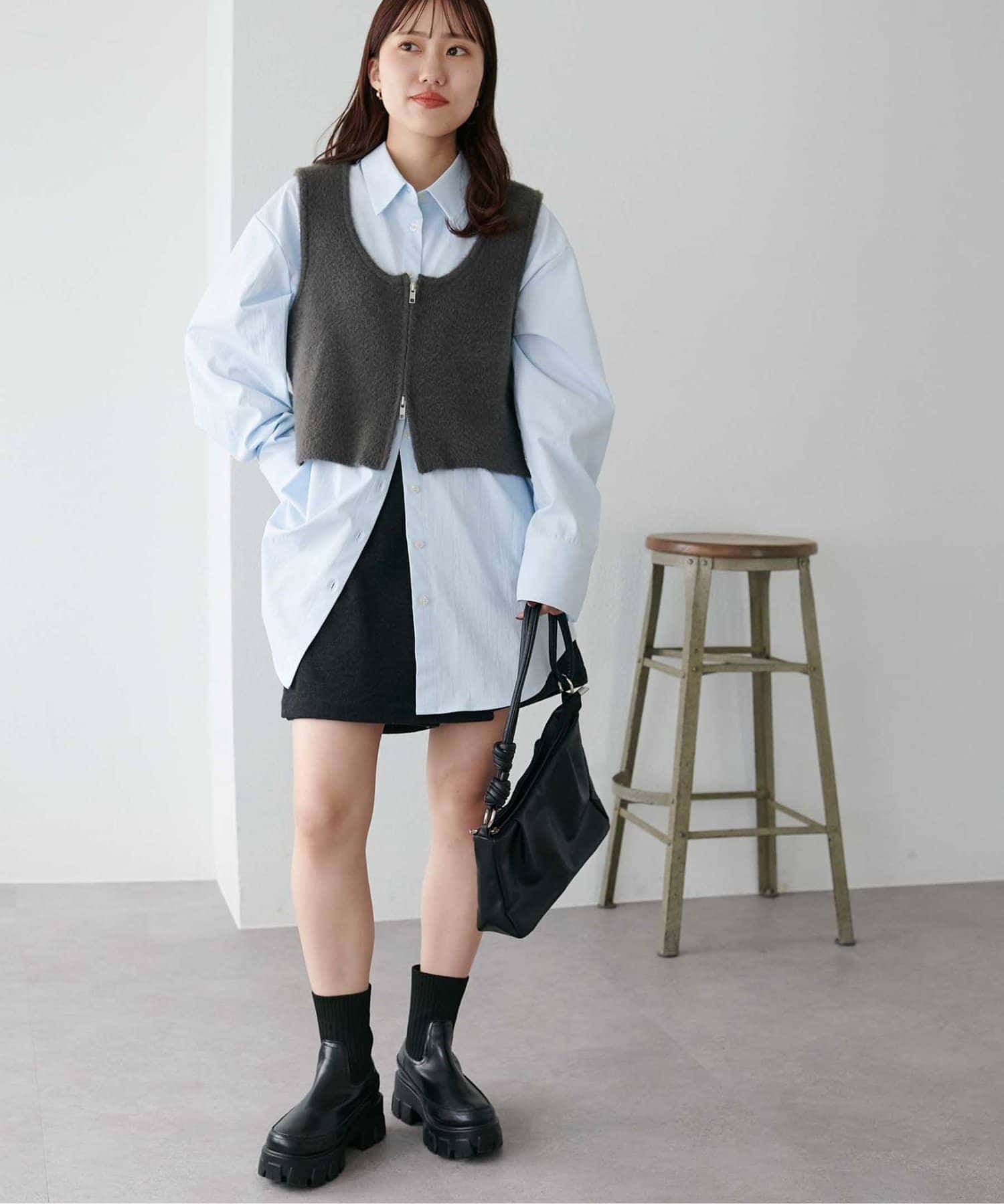 シンプルなブルーシャツ・グレーのベストと、