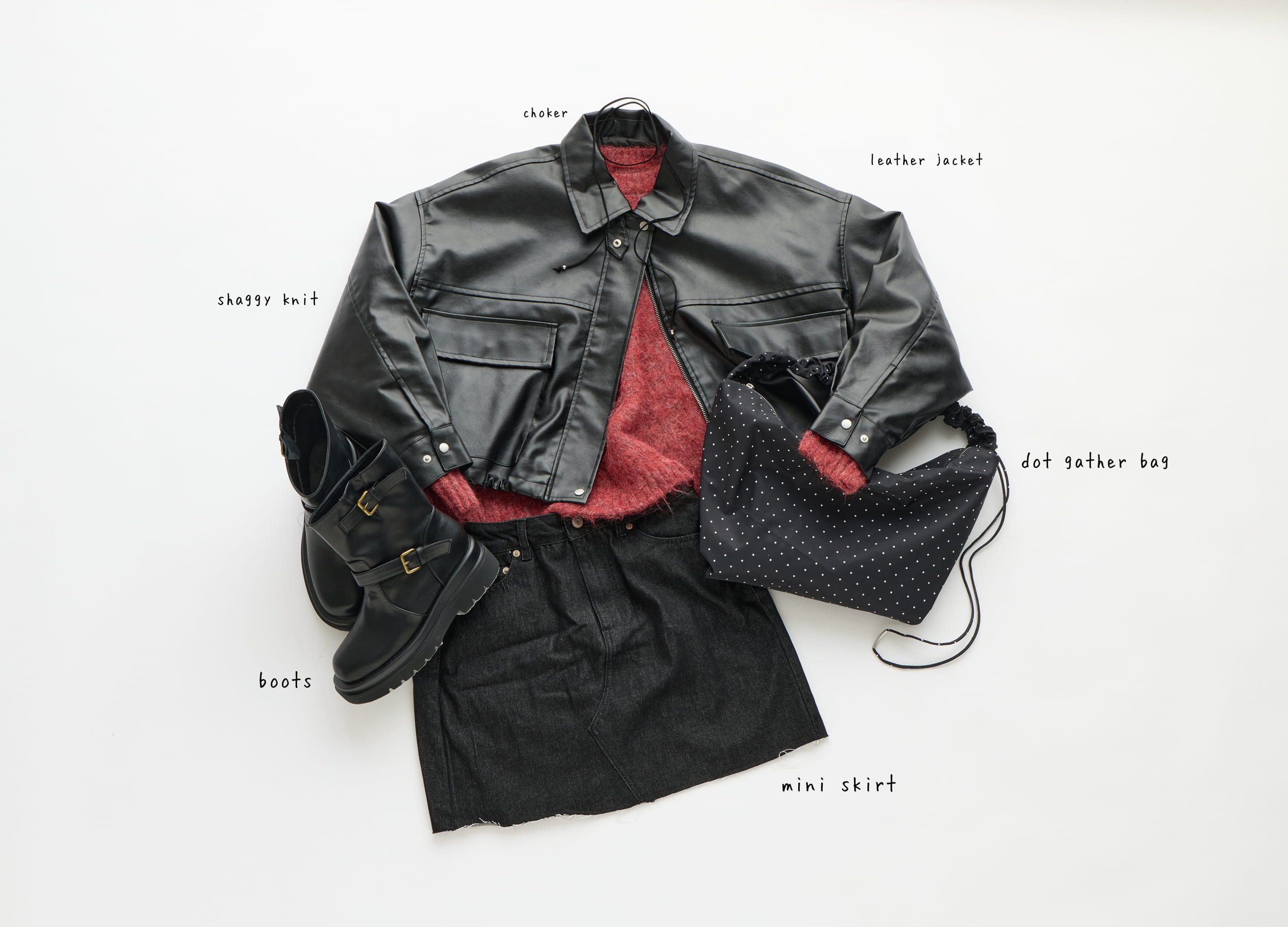 レザーのブルゾンにピンクのシャギーニットが相性抜群!