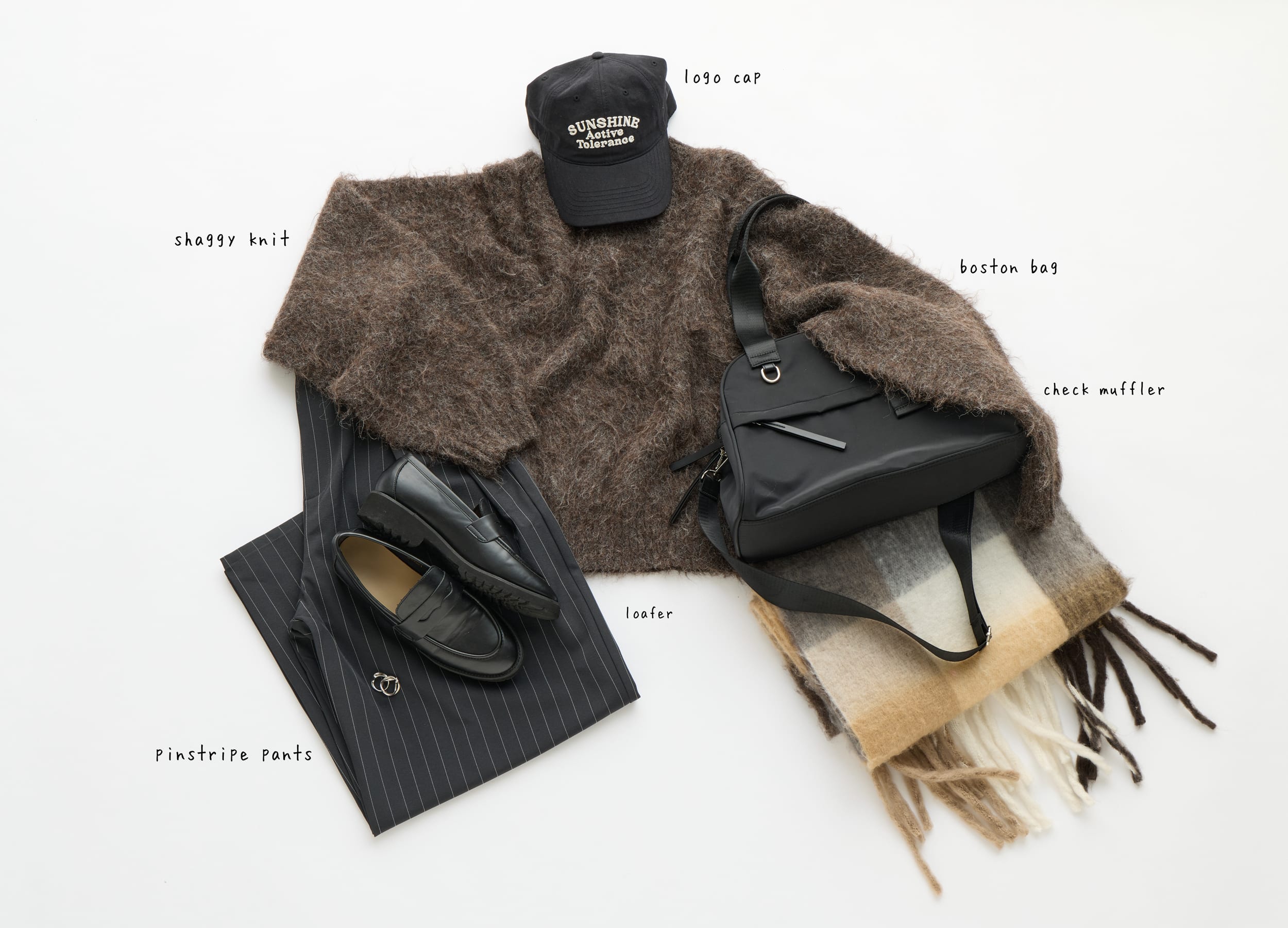 チェックマフラーとボストンバッグでトラットな雰囲気をプラスし黒のキャップで全体を引き締めれば今っぽい抜け感のあるスタイリングに!