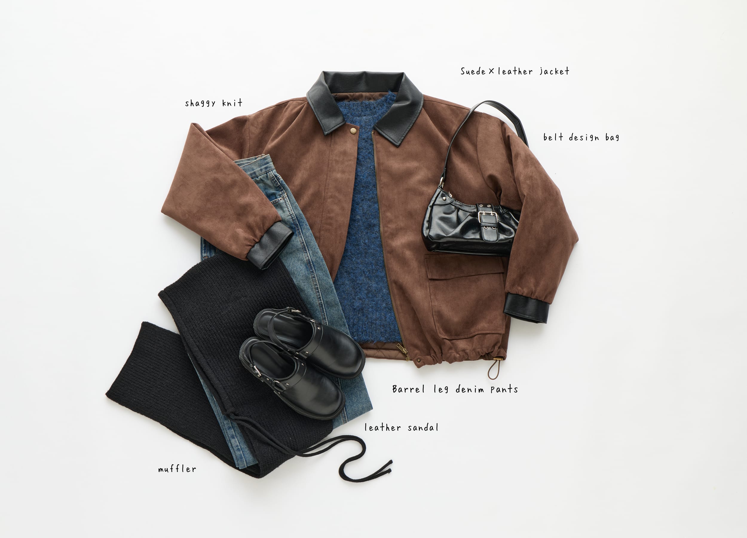 ブルーのシャギーニットにブラウンのスエード&レザーのジャケットを重ね、デニムの抜け感に