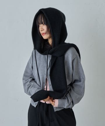 ブラックのフード付きマフラーとベルトバッグを効かせた洗練された都会スタイリング。