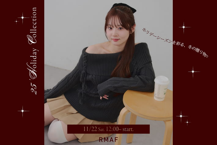 2025.11.12 NEW Remind me and forever(リマインドミーアンドフォーエバー)【11/22(土)12:00スタート!】Holiday Collection ホリデーシーズンを彩る、冬の贈り物♡ - 1年頑張ったアナタへのご褒美に - PRE ORDER11/22(Sat.)12:00~ start. レース裾バルーンミニワンピース Saxe blue / Gray / Charcoal gray / Brown ¥7,700(in tax) 後Bigリボンニット Ivory / Bordeaux / Gray ¥7,150(in tax) マルチWAYニットワンピース Ivory / Gray / Charcoal gray ¥7,700(in tax) ▼その他おすすめアイテムはこちら▼ 2025.11.10 NEW Remind me and forever 【告知】2026福袋11/17(月)13:00~販売決定! 2025.11.07 Remind me and forever \今年の冬買うならこれ!/アウターコレクション 2025.11.06 Remind me and forever レビューポイントアップキャンペーン開催! 2025.10.31 Remind me and forever \一枚で着映え!/デニムドッキングカーディガン 2025.10.24 Remind me and forever いしよわちゃん×RMAFが初コラボ! 2025.10.15 Remind me and forever 【Ribbon Collection】10/23(木)18:00~予約スタート 2025.10.09 Remind me and forever 【Mavie..7】10/23(木) 18:00~ 第2弾スタート! 2025.09.25 Remind me and forever 【あなたの♡で決まる!】お気に入り"ニット"総選挙vol.1 ニュース一覧へ > < ニュース一覧へ >