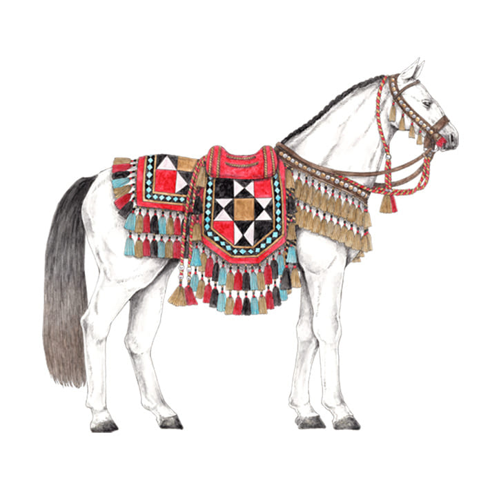新年を祝う気持ちで、干支である馬に装飾を加えた描き下ろしイラスト。 馬の装飾はキリム柄のモチーフを取り入れたエスニックな雰囲気でまとめ、 白馬に合う装飾品やカラーリングで仕上げました。 馬に装飾を施すことは、お祭りやお祝いの場でされることが主ですが、 同時に魔除けや幸運を呼ぶといった護符的な意味や、豊穣、安全、家族の幸せを願うなど 様々な意味が込められていると言われています。 新しい年が、華やかで幸福なものになるよう願って今回の柄をお届けします。