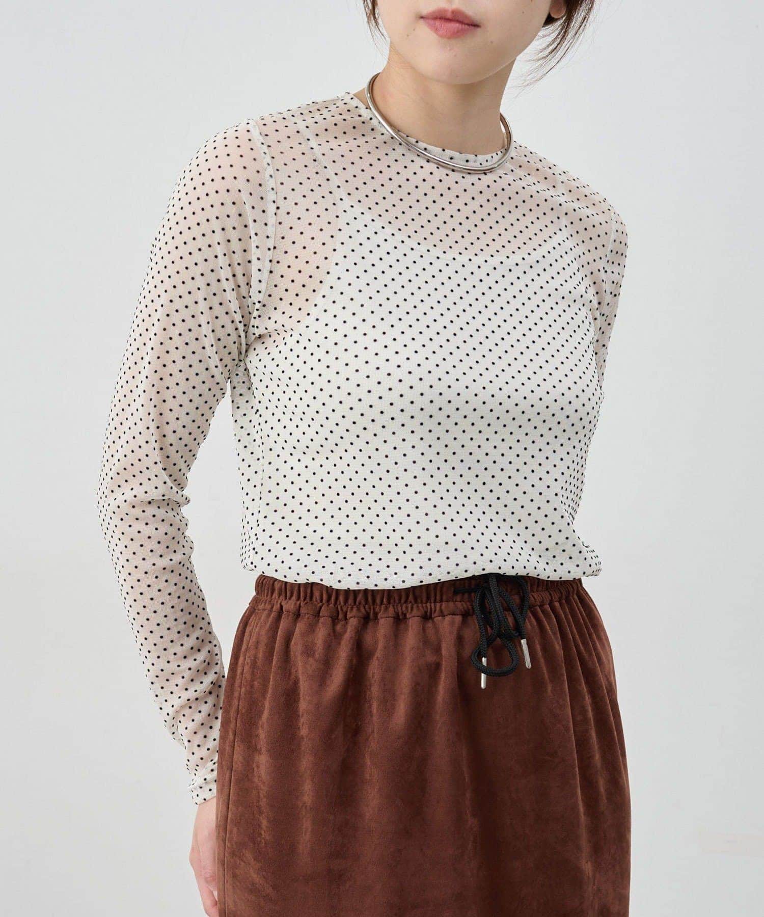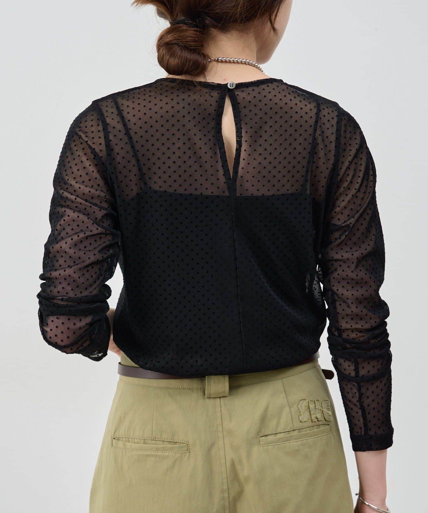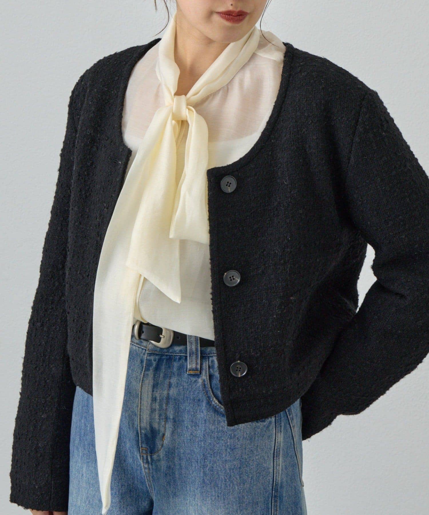 シアー素材の女性らしさとボウタイのシャープな雰囲気が目を引く1枚。