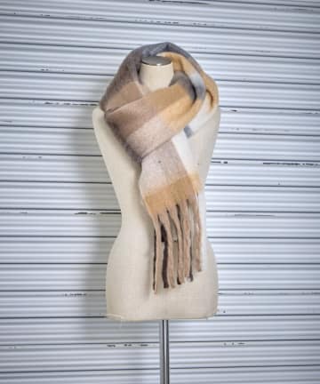 オレンジのチェックマフラーをポイントにして季節感のある暖かコーデに!◎
