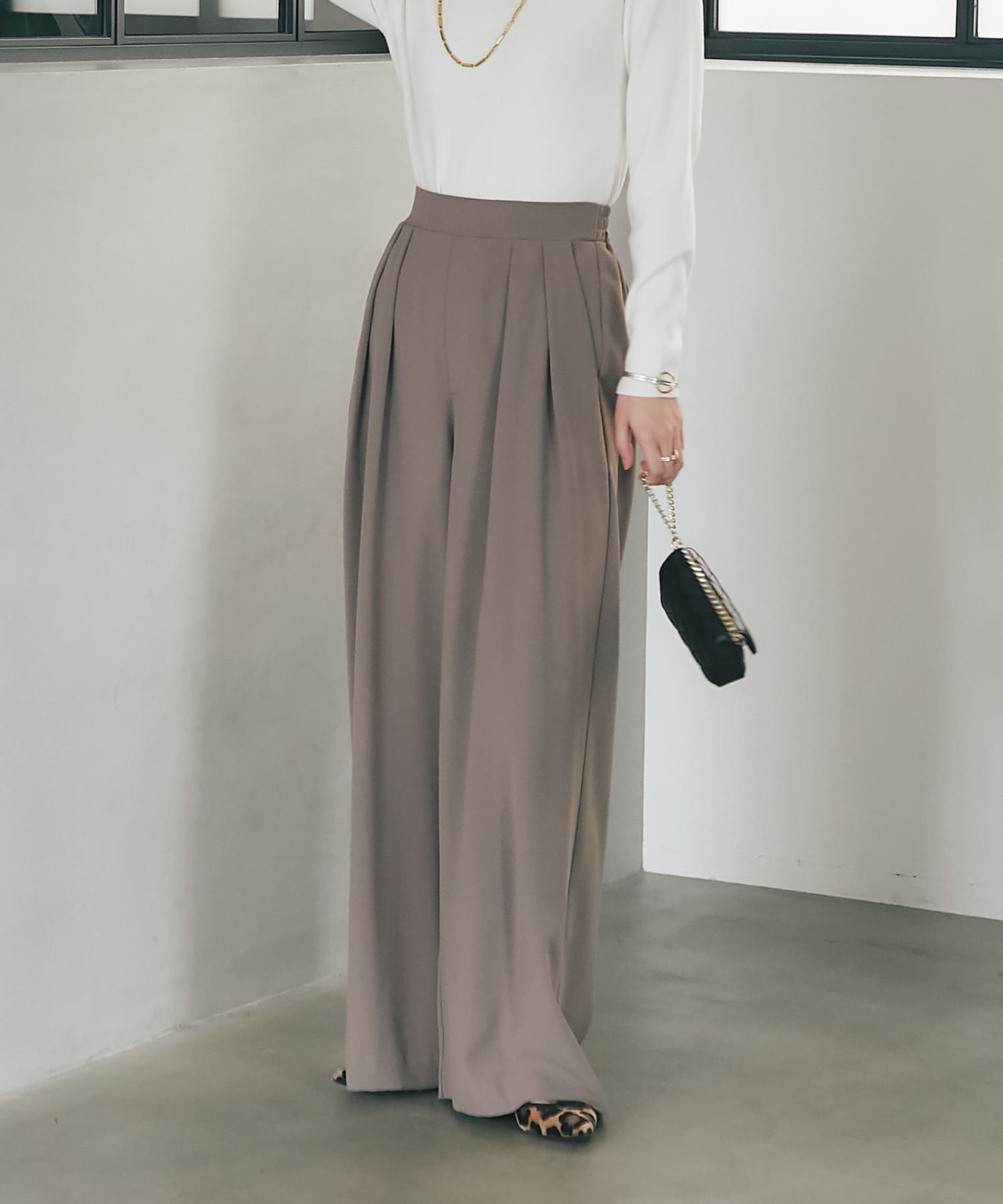 ・生地の落ち感ととろみ感が女性らしい柔らかなタックパンツです。