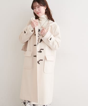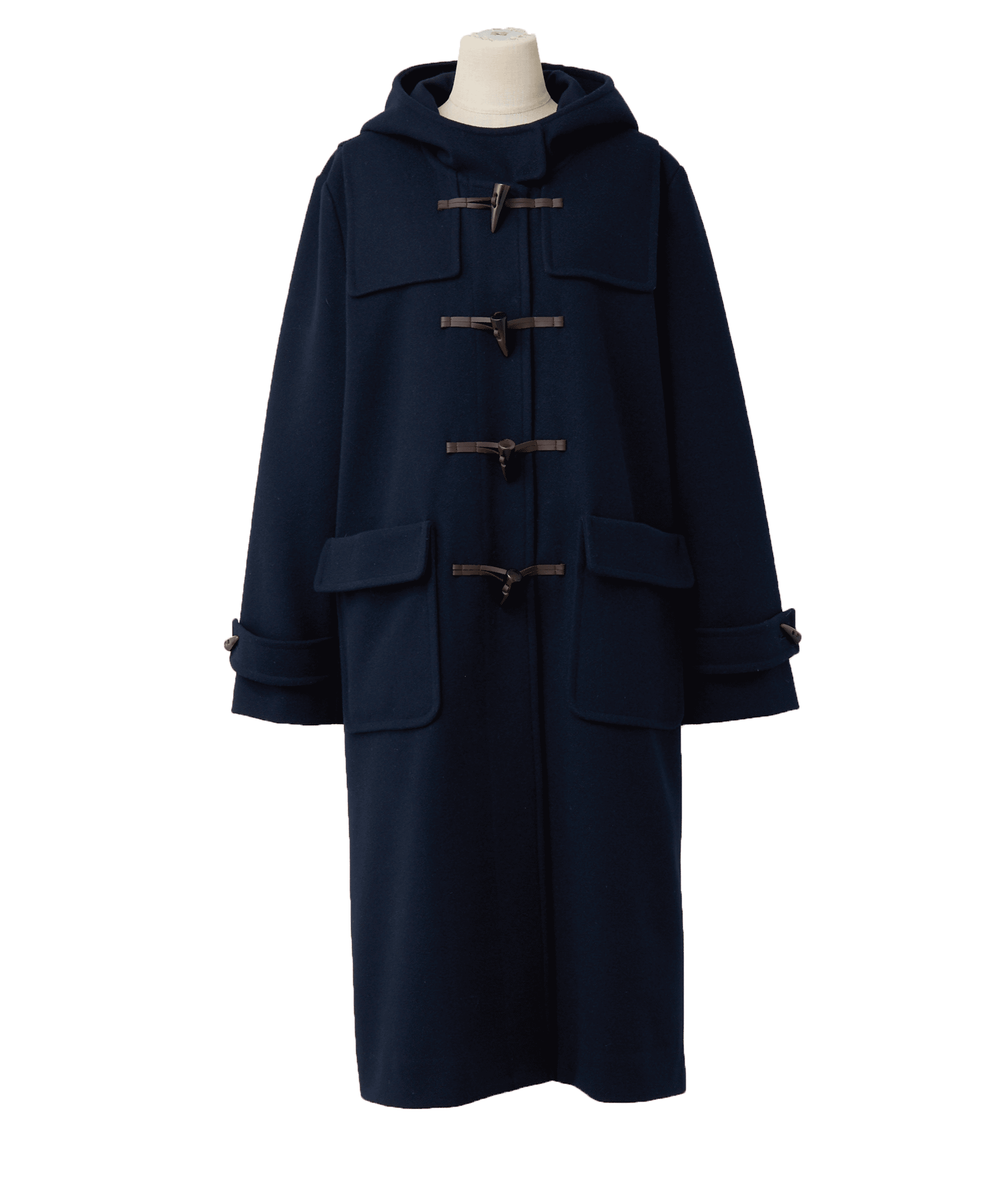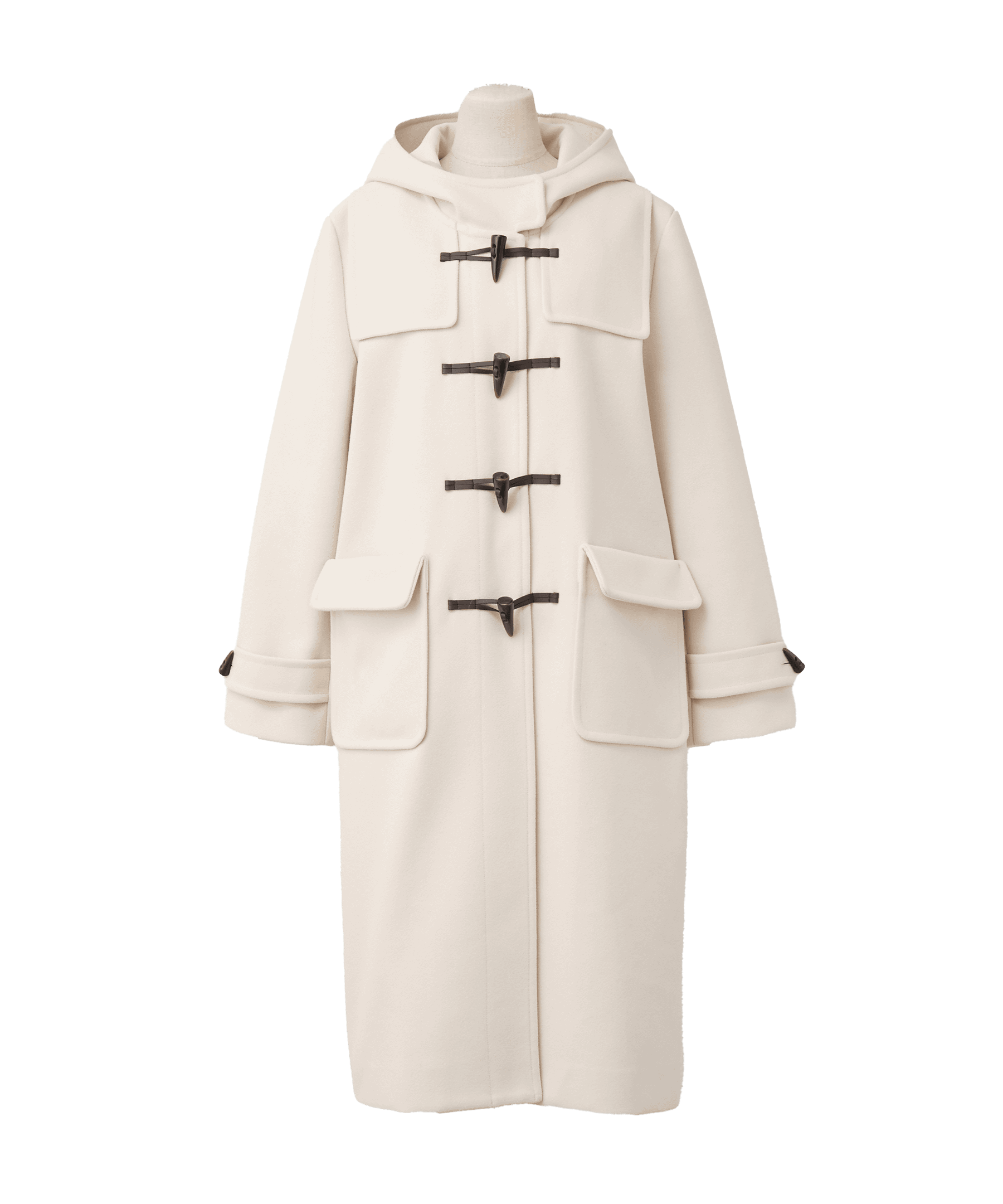 長めの丈感は、体型をカバーしつつ、上品で落ち着いた印象を与えます。フードは顔周りを華やかに演出し、小顔効果も期待できます。トグルボタンは、クラシカルな雰囲気を醸し出し、デザインのアクセントに。