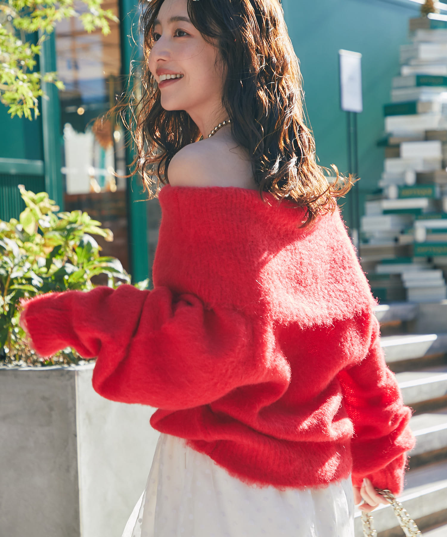 女子力たっぷりで人気のオフショルニット新色レッドや、