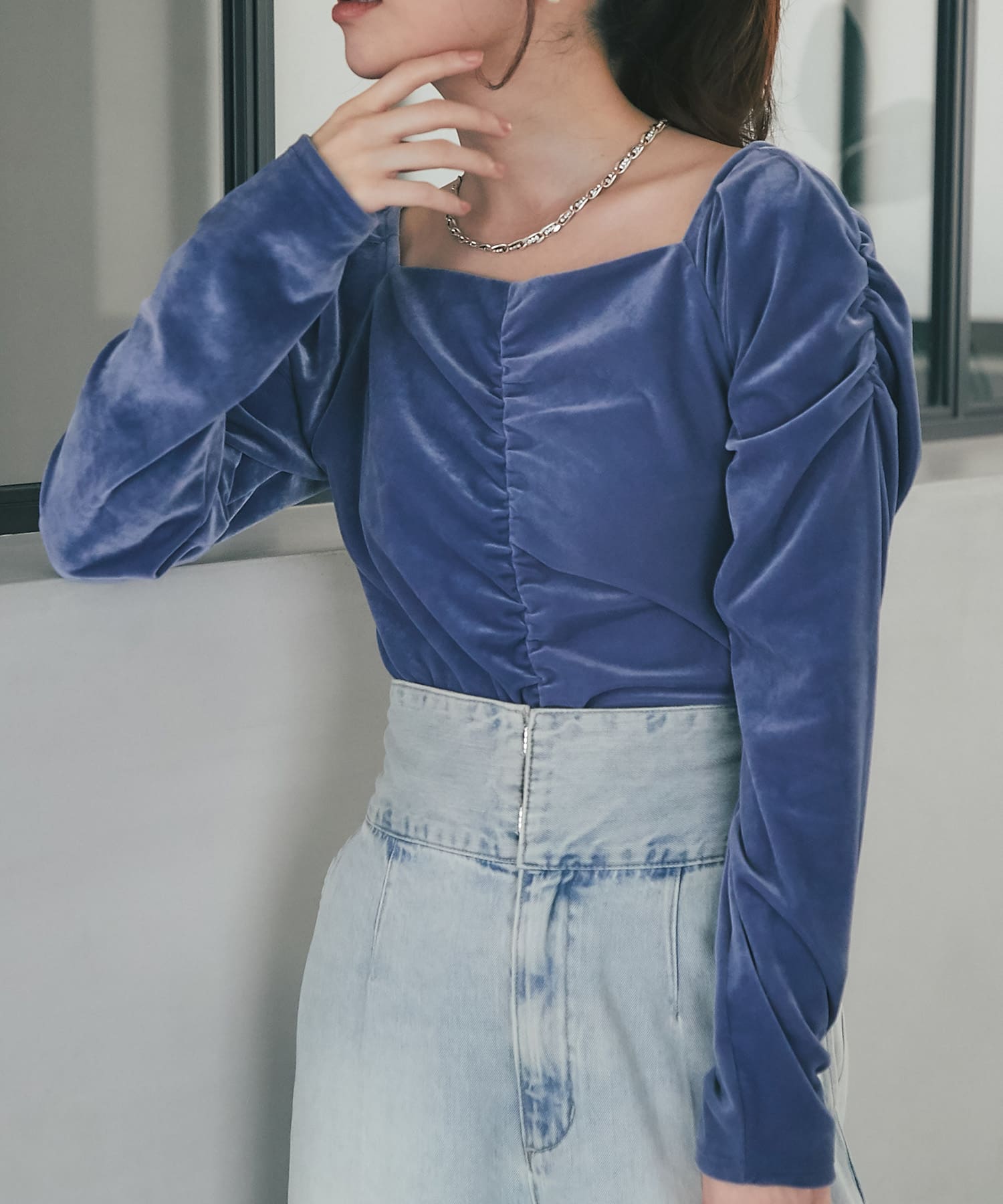 スクエアネックとシャーリングディテールがデコルテを美しく、より女性らしく演出。