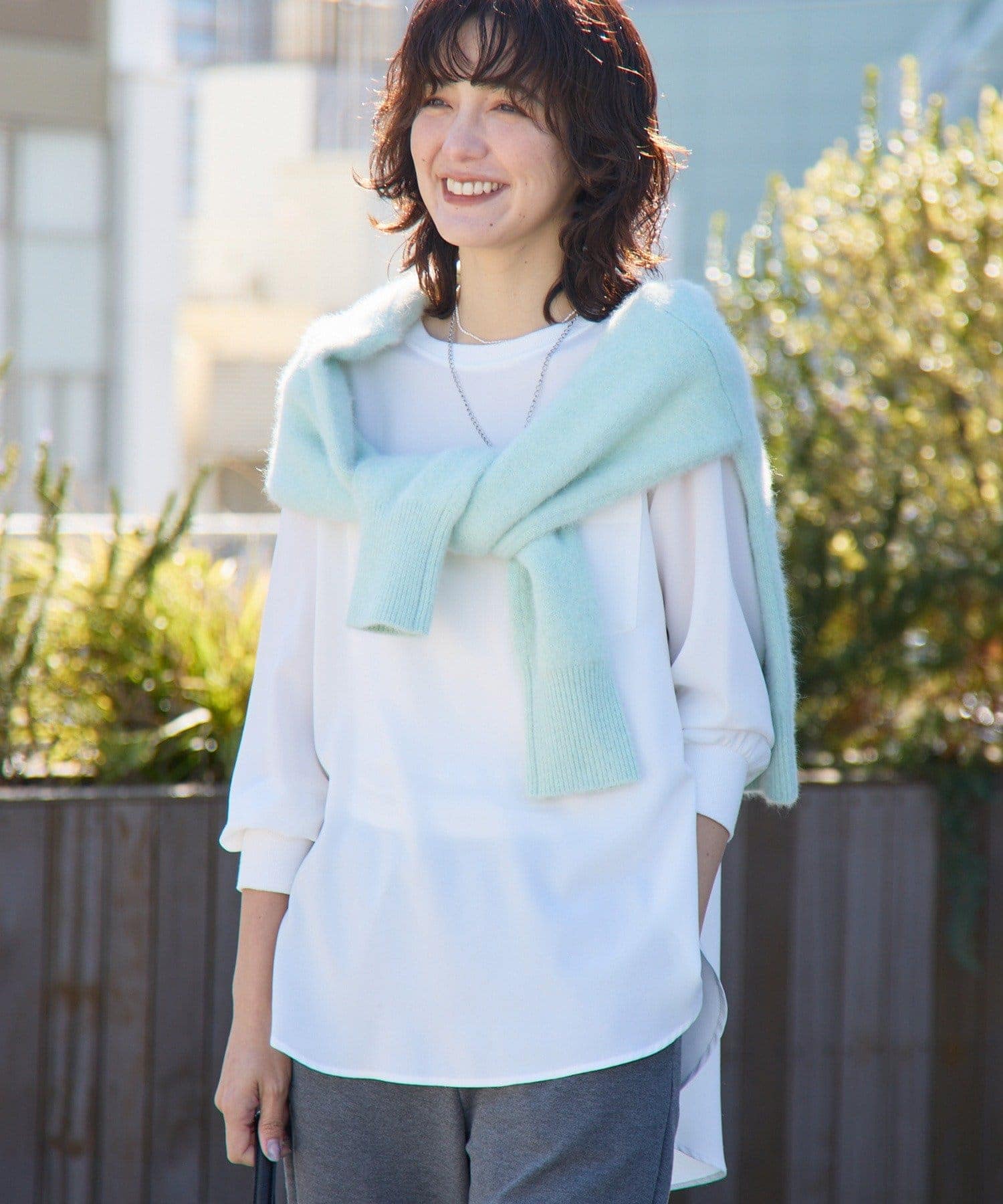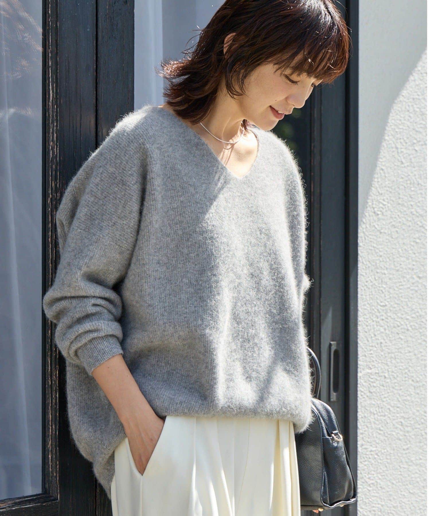 ゆとりのある着丈、身幅で着やすく、開きすぎないけれどすっきりと見える衿の開きが特徴的なニット。