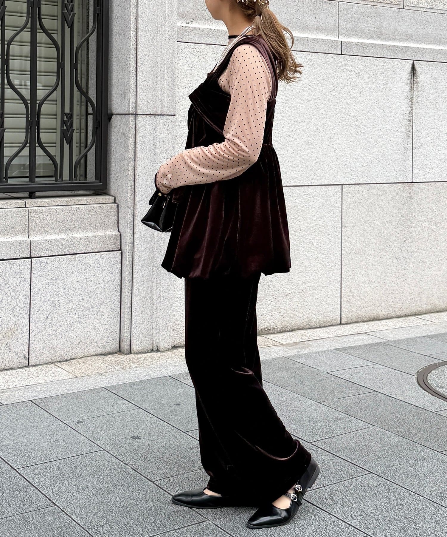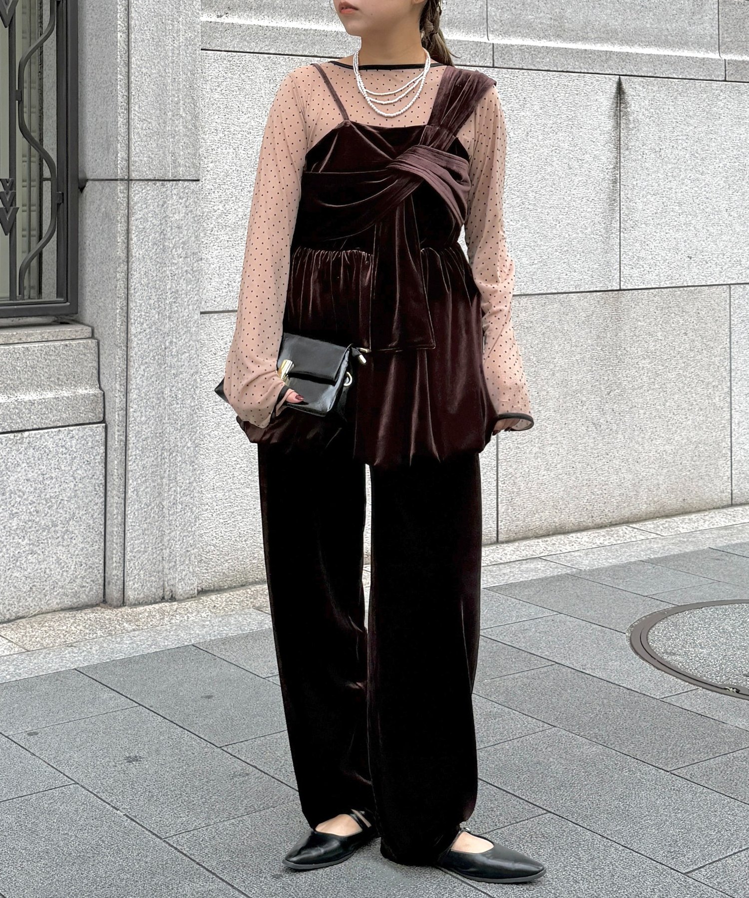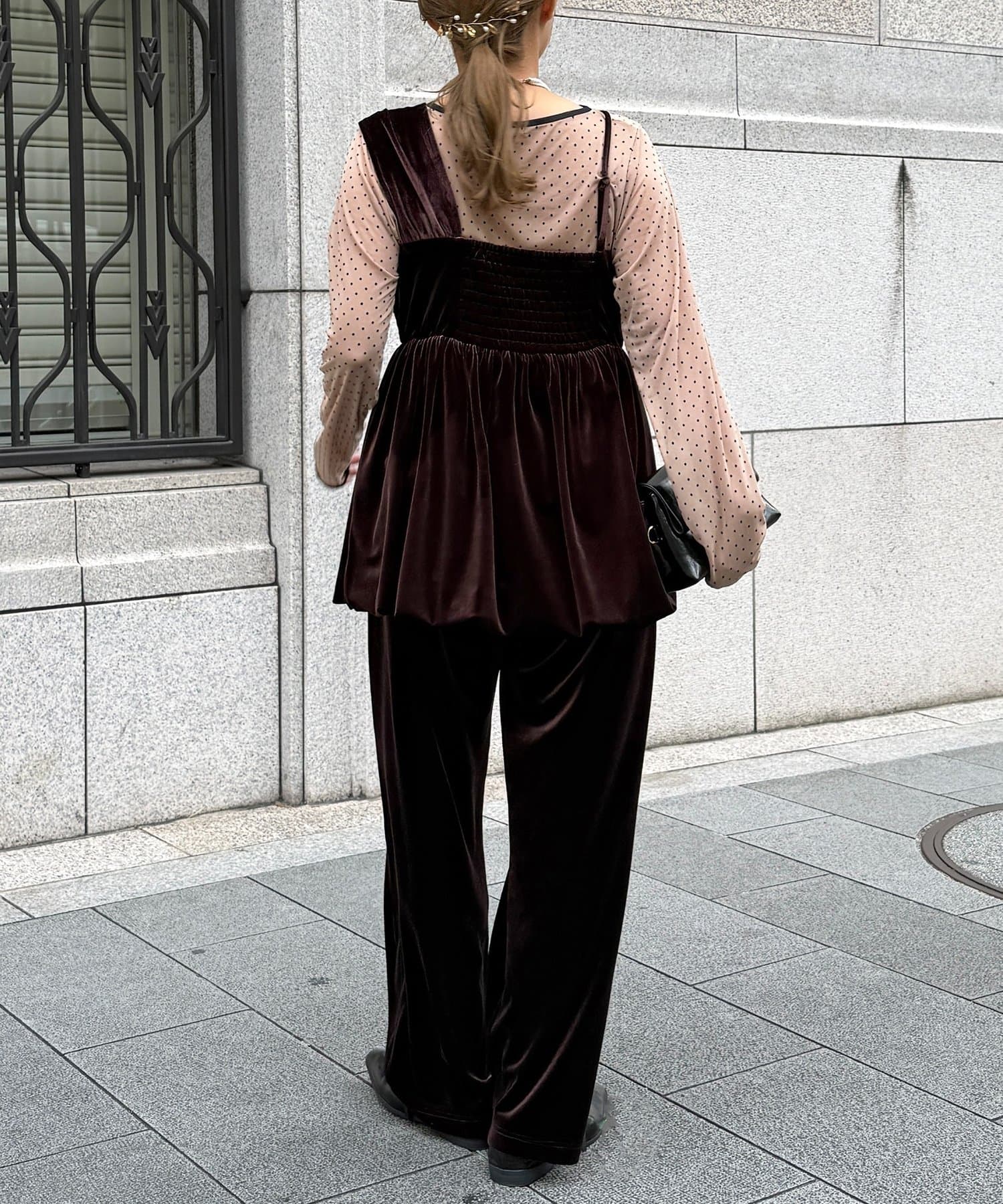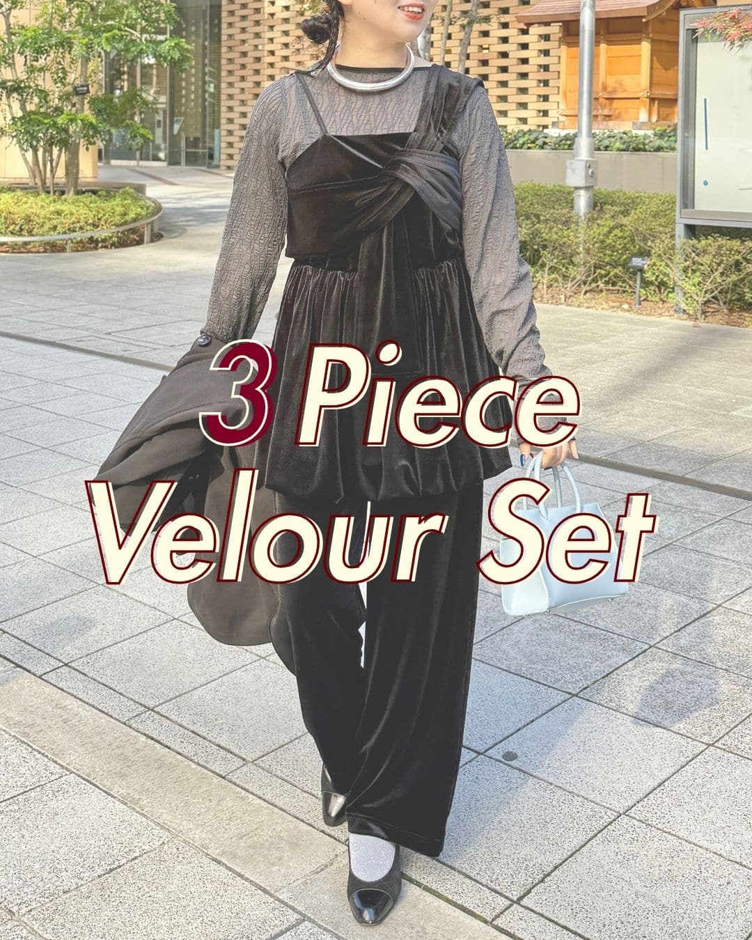 チュールトップス、ビスチェ、イージーパンツの3点がセットになった、日常使いにもぴったりのベロアセットアップ。