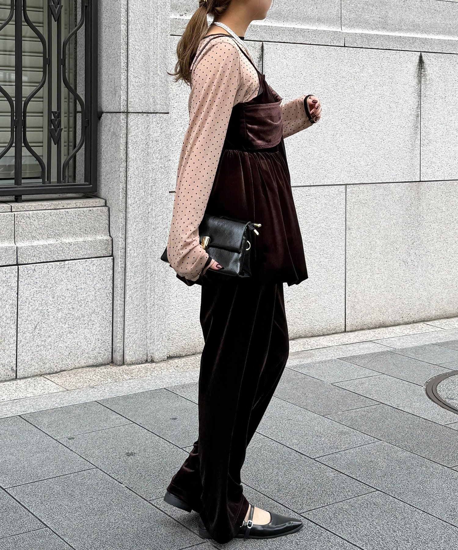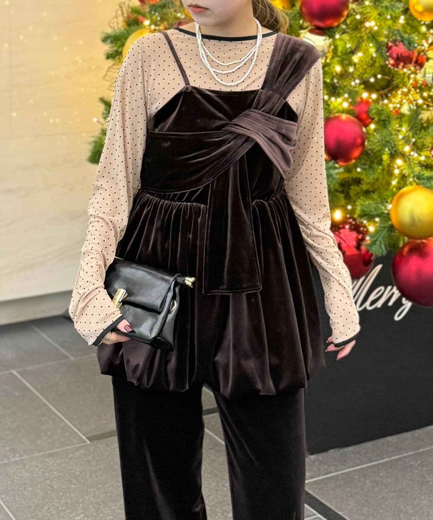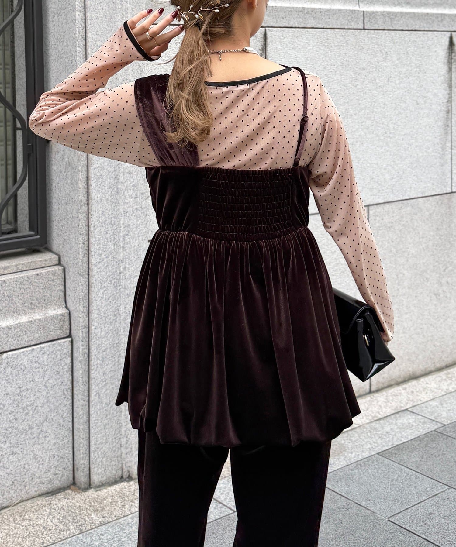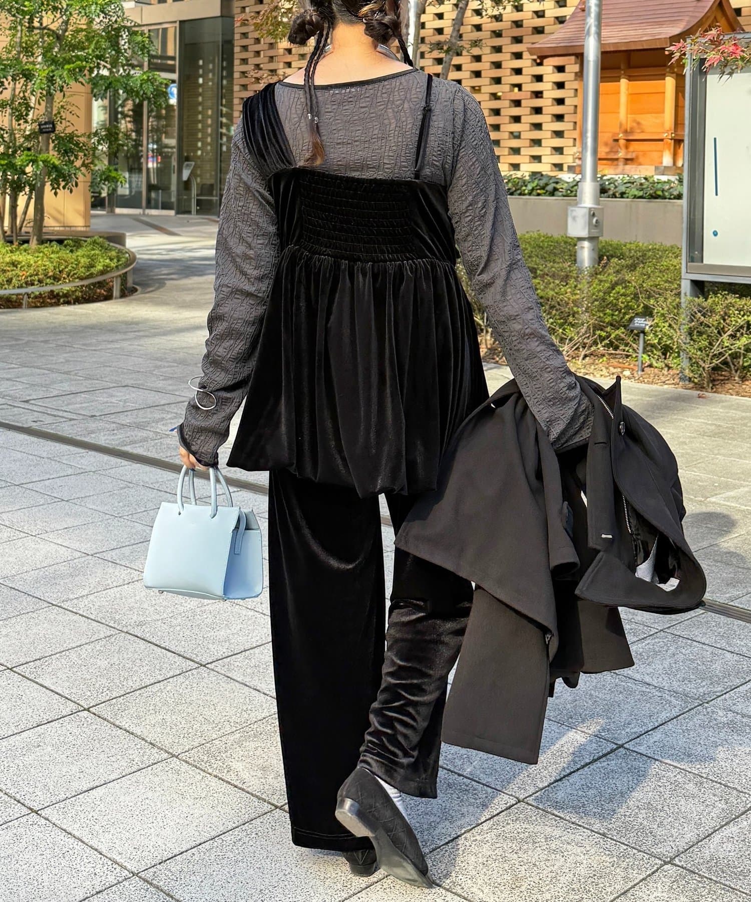 チュールトップス、ビスチェ、イージーパンツの3点がセットになった、日常使いにもぴったりのベロアセットアップ。
