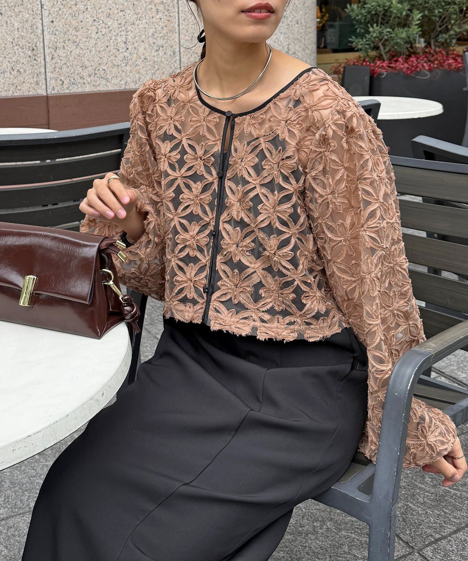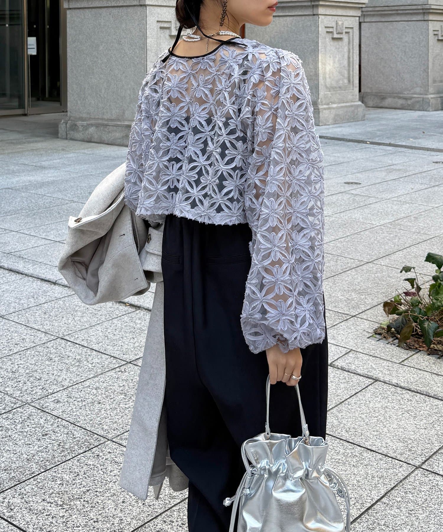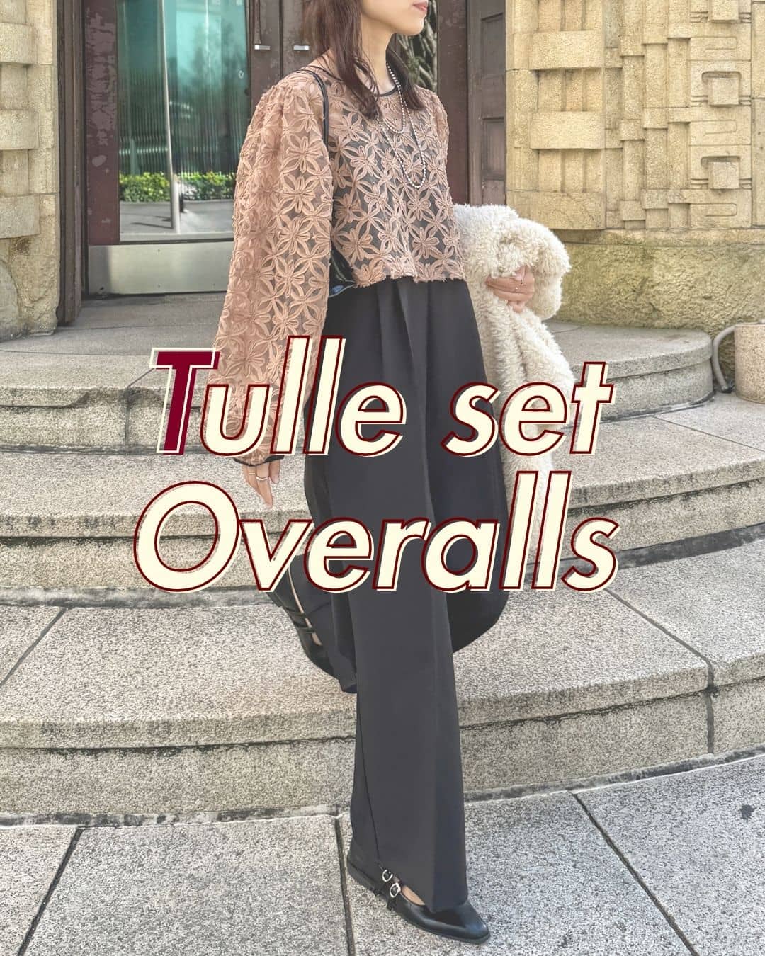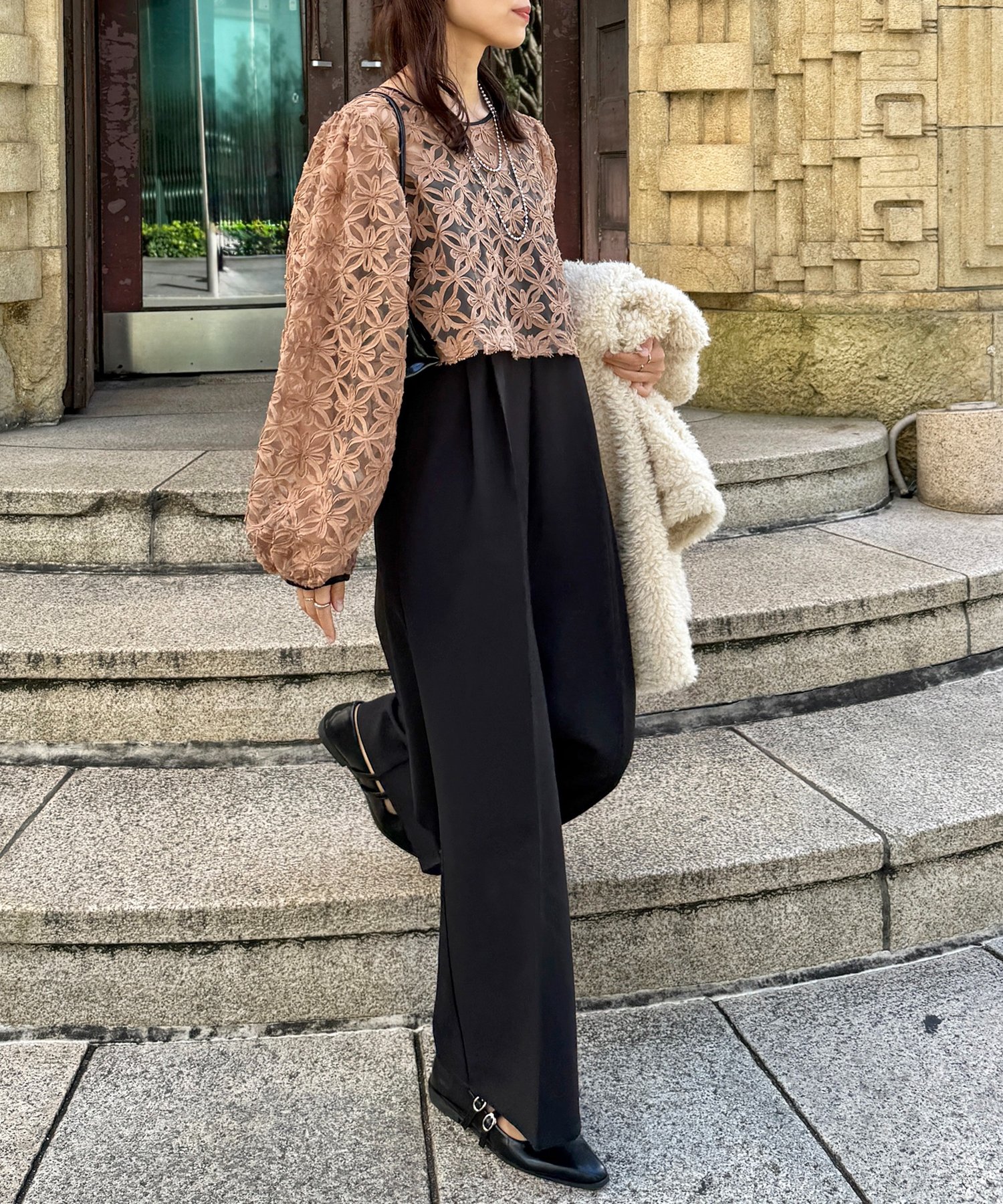 チュールトップス、ビスチェ、イージーパンツの3点がセットになった、日常使いにもぴったりのベロアセットアップ。