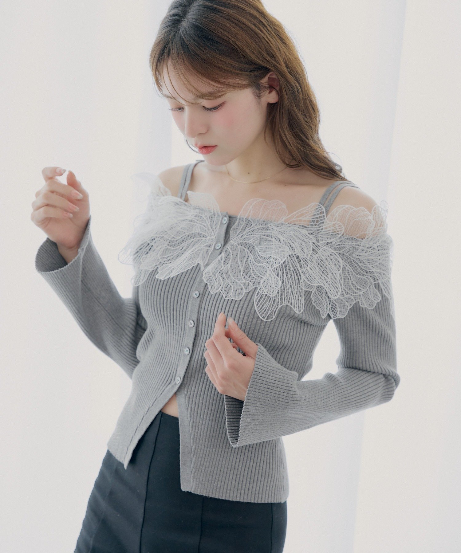 -取り外しフリル襟フラワーニットジャケットカーディガン-