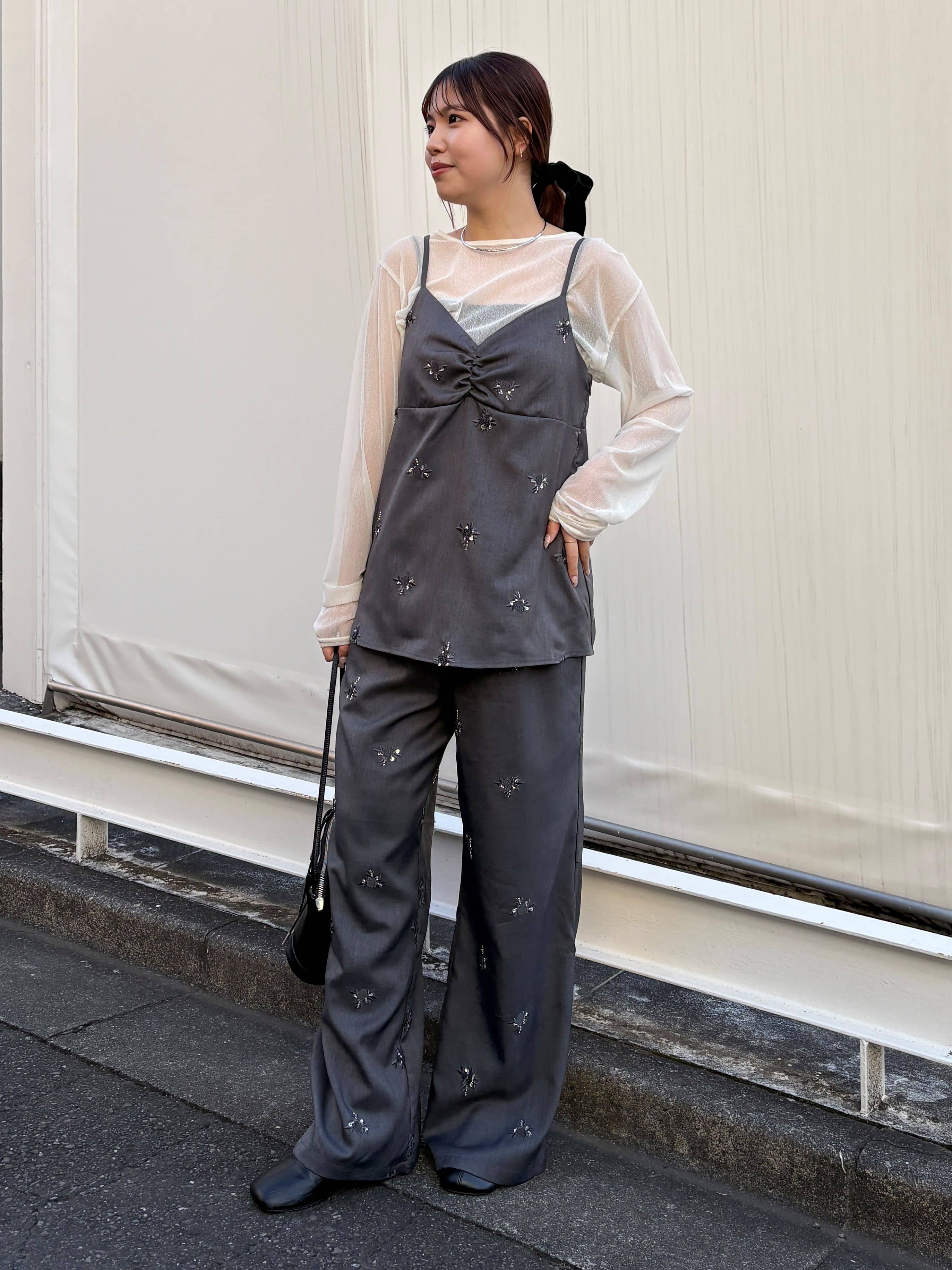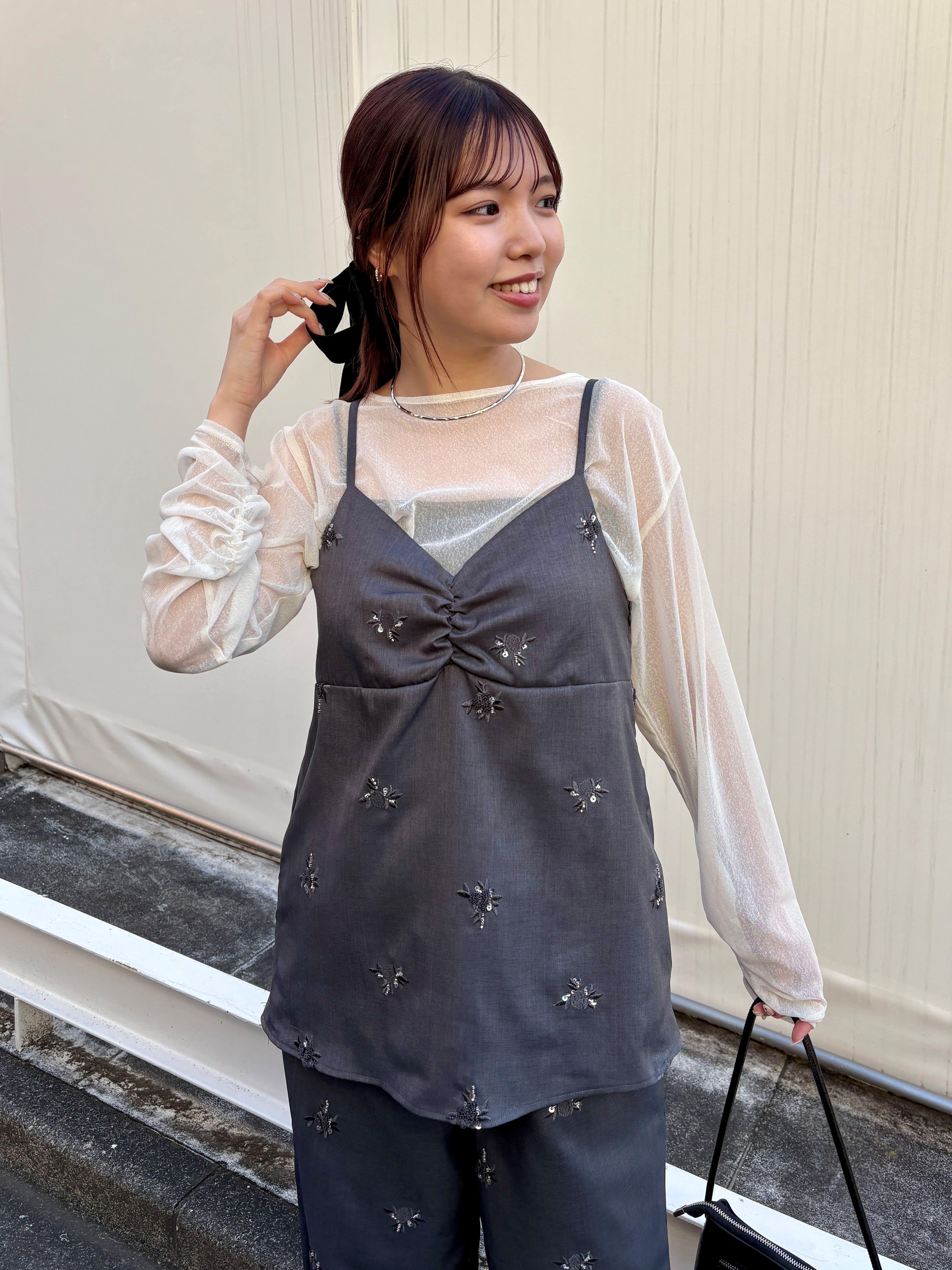 ビジューの刺繍が全体に散りばめられているので、スタイリングに華やぎをプラスしてくれます。