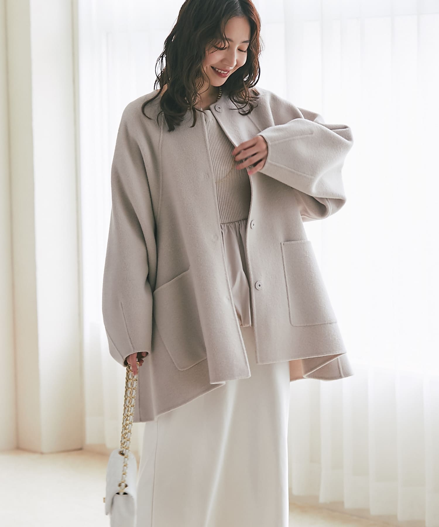 ・ボリューミーな袖にノーカラーで抜け感もばっちり。
