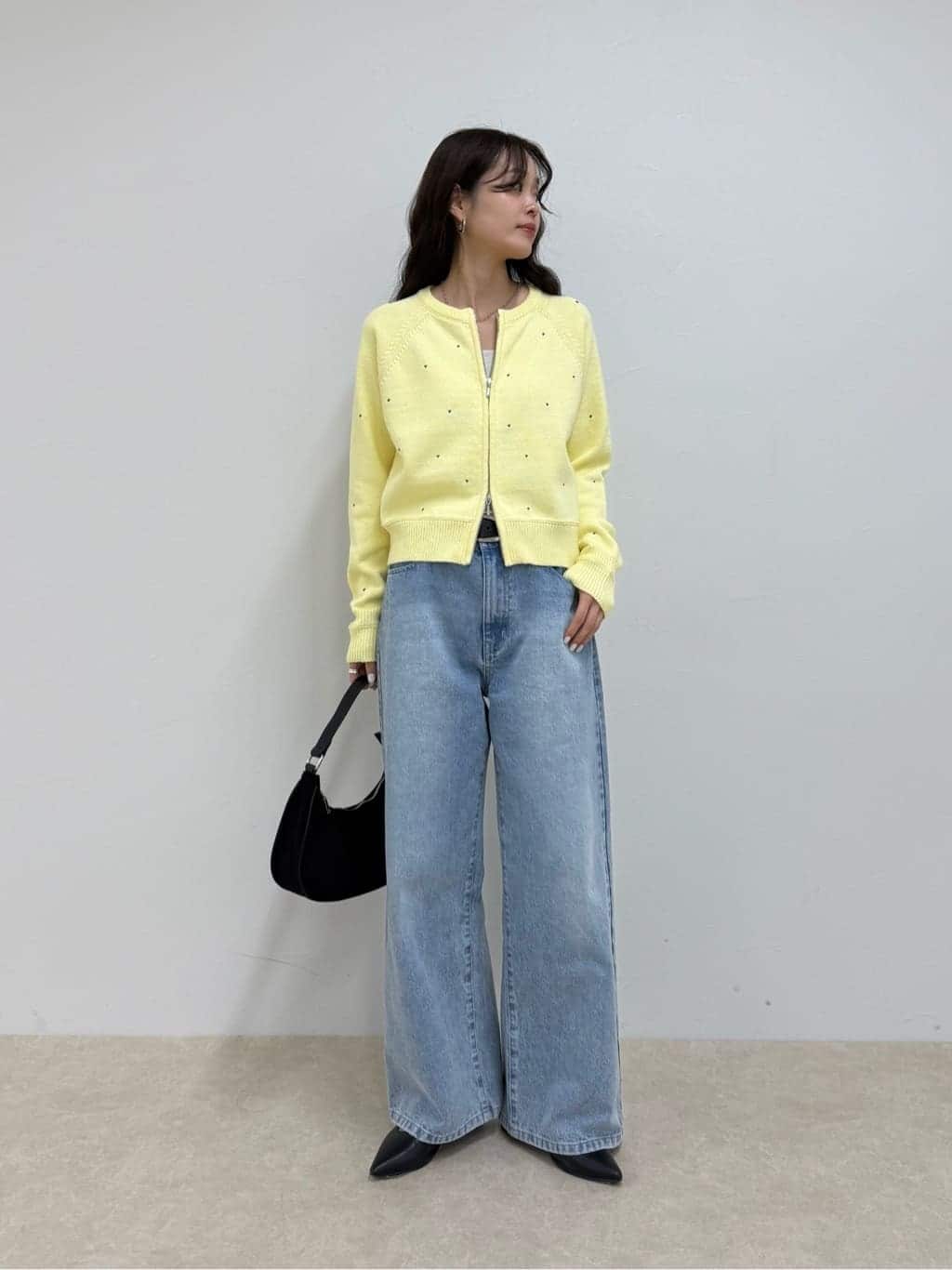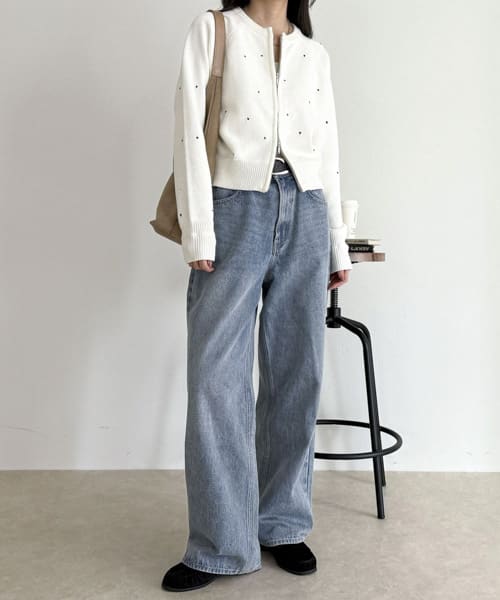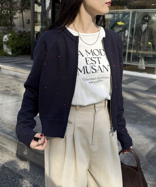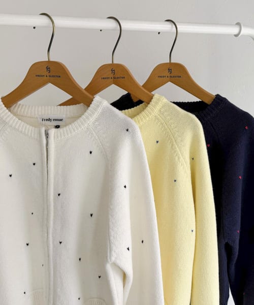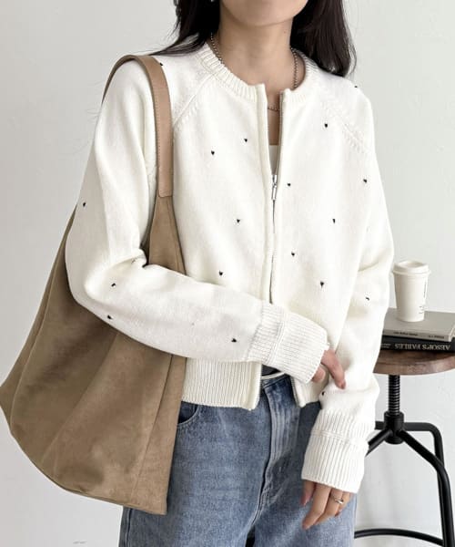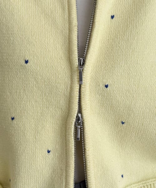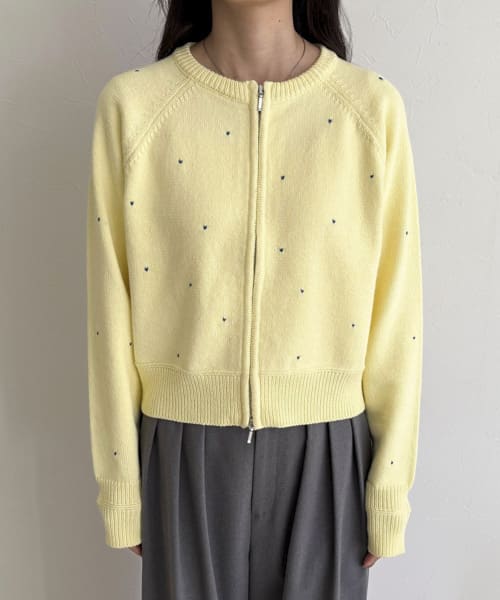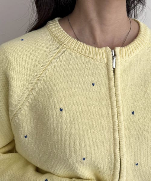 - ミニサイズのハート刺繍がさりげなくも目を惹くジップカーディガン