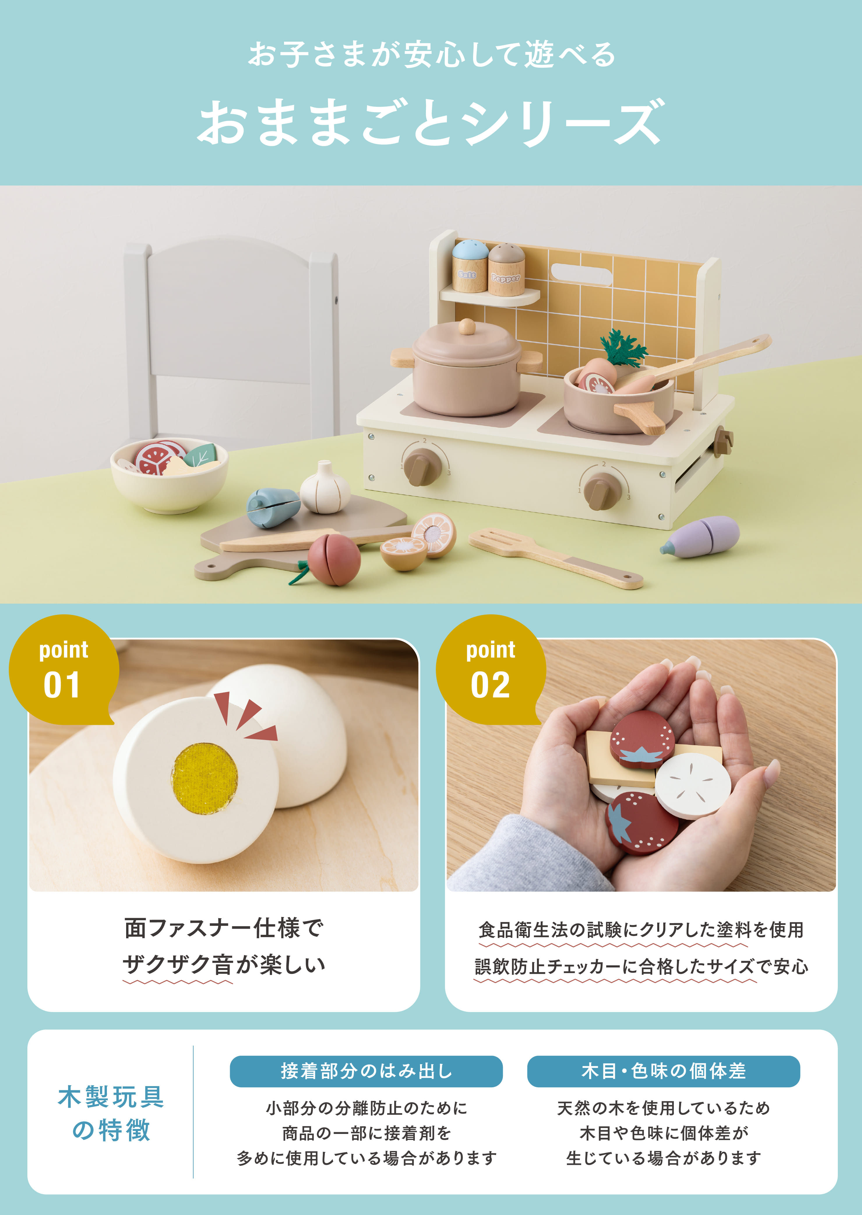 木のぬくもりとくすみカラーが魅力のデザインで、シリーズをそろえれば、毎日のおままごとがもっと楽しくなります♪