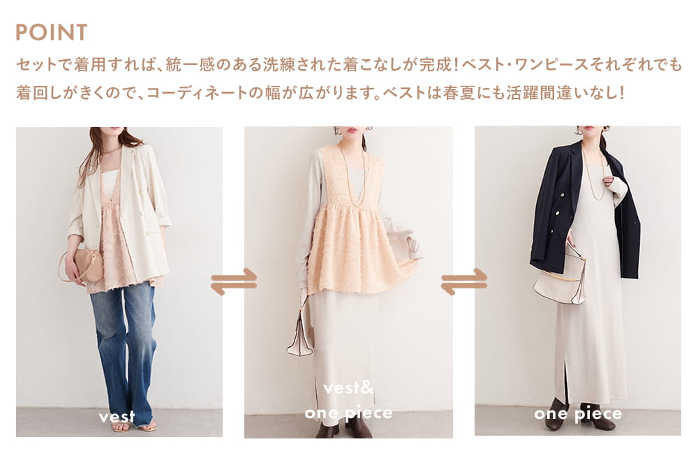 販売から人気のセットワンピが登場! 立体的で奥行きのある花柄ベストが、シンプルなスタイリングに華やかさをプラス。 ベストの絶妙な丈感は、体型カバーやスタイルアップ効果も期待できます。 ワンピースは、さりげないラメ感が動くたびに上品な輝きを放ち、周囲の視線を惹きつけること間違いなし。