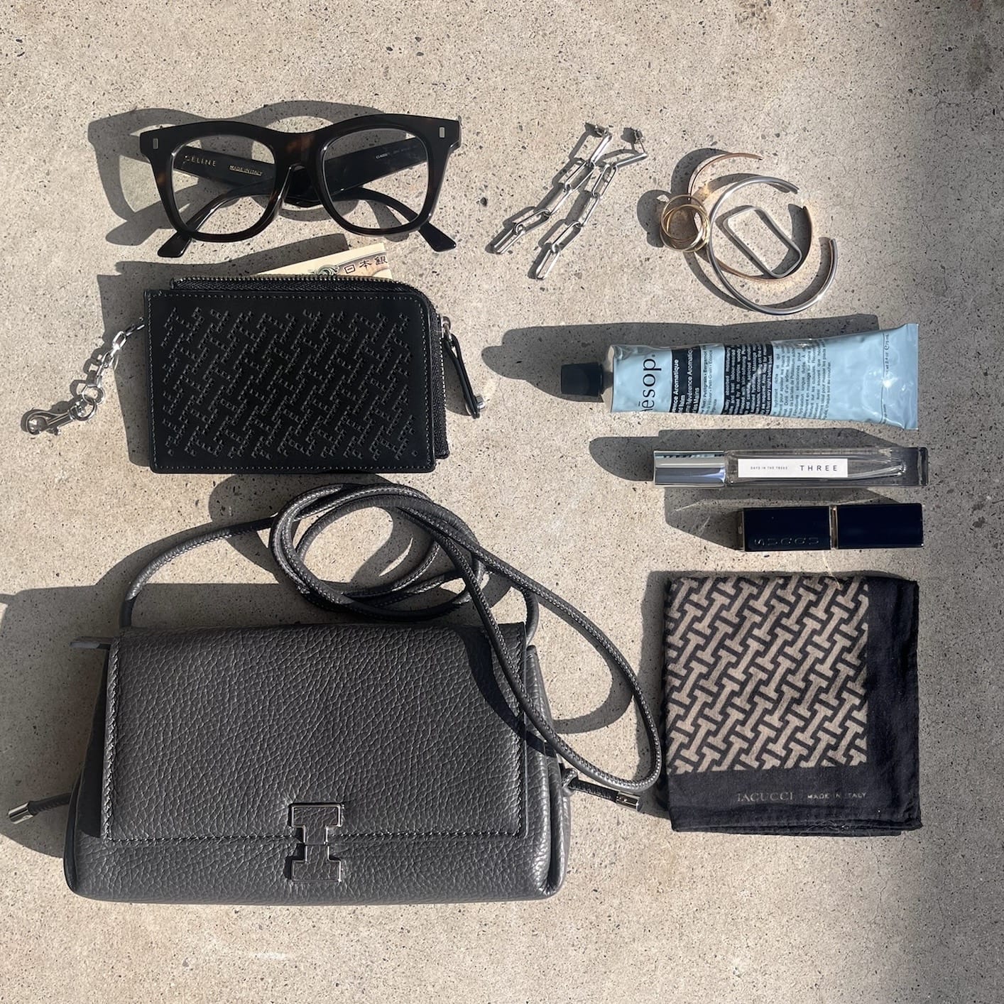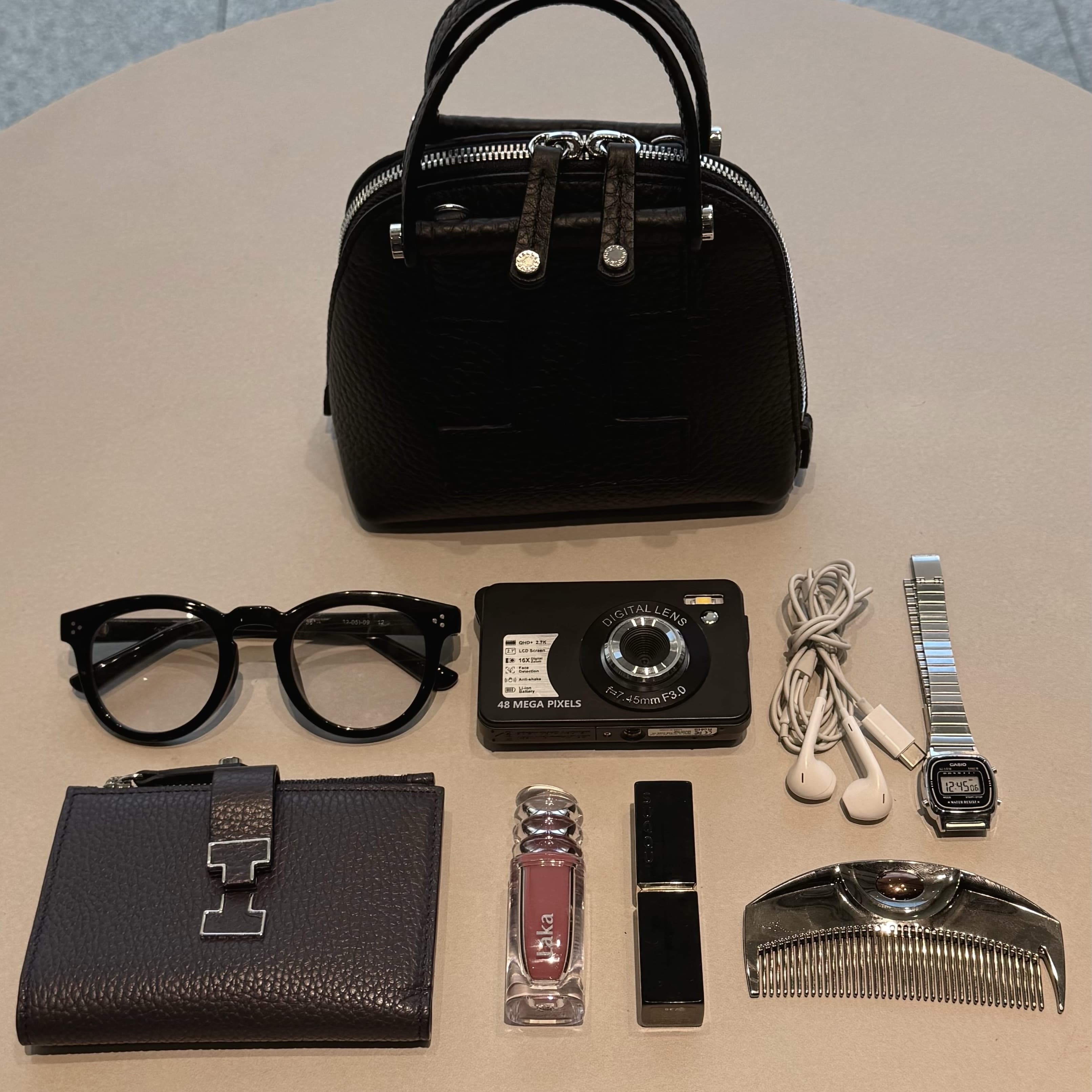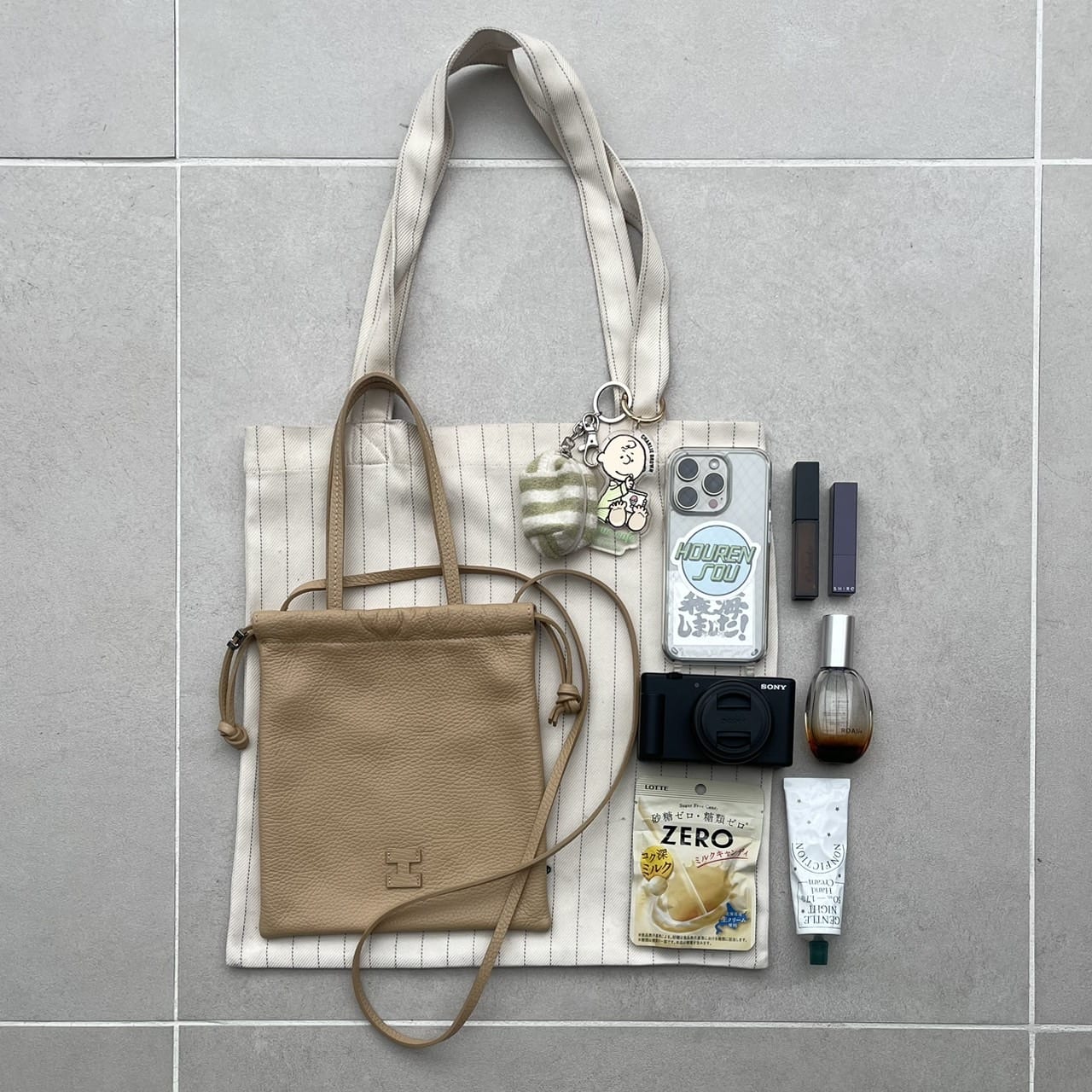 貴重品を入れるミニショルダーと、サブバッグとの2個持ちがお出かけの時のスタイル。旅行時は貴重品を常に身に着けておきたいので、身体にフィットしてくれる薄マチの2WAYトートをセレクトしました。今年ゲットしたカメラも入るのもセレクトのポイント!