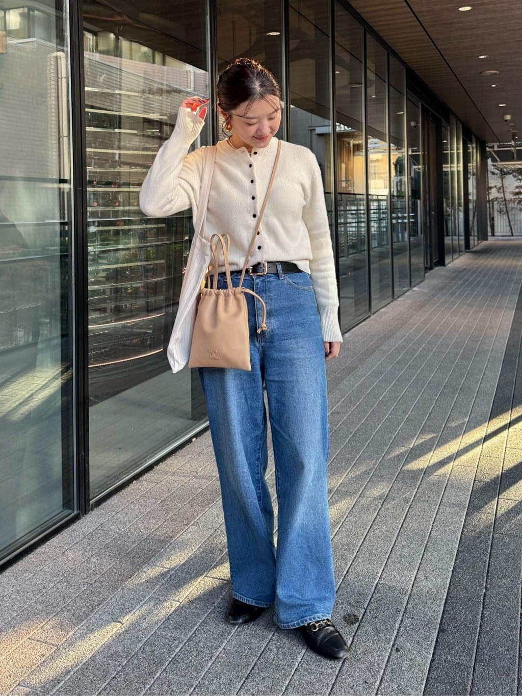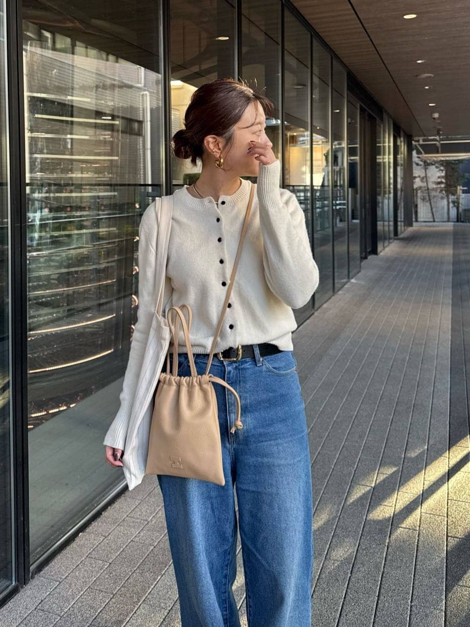両手を開けたい時はショルダーバッグとしても活躍しますが、少しきれいめに持ちたい時はシルエットを変えてハンドバッグとしても◎。お出かけや帰省で持っていくバッグは基本一つなので、スタイルに合わせて持ち方を変えられるのも魅力です。