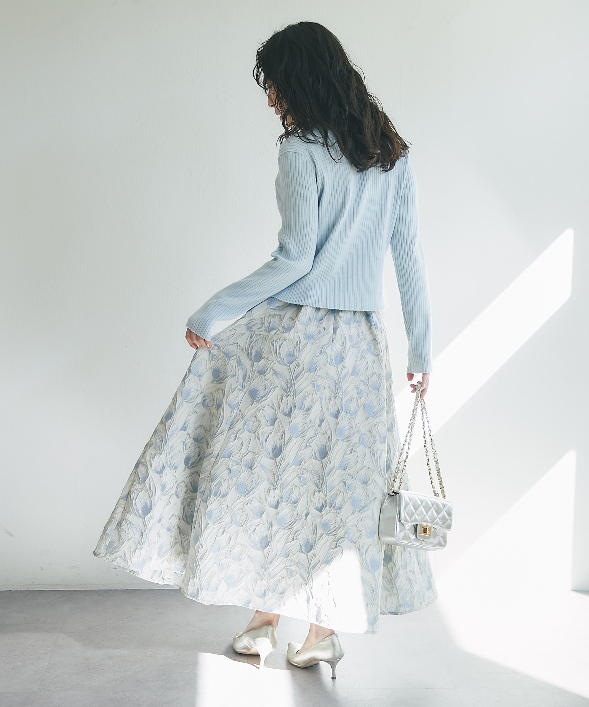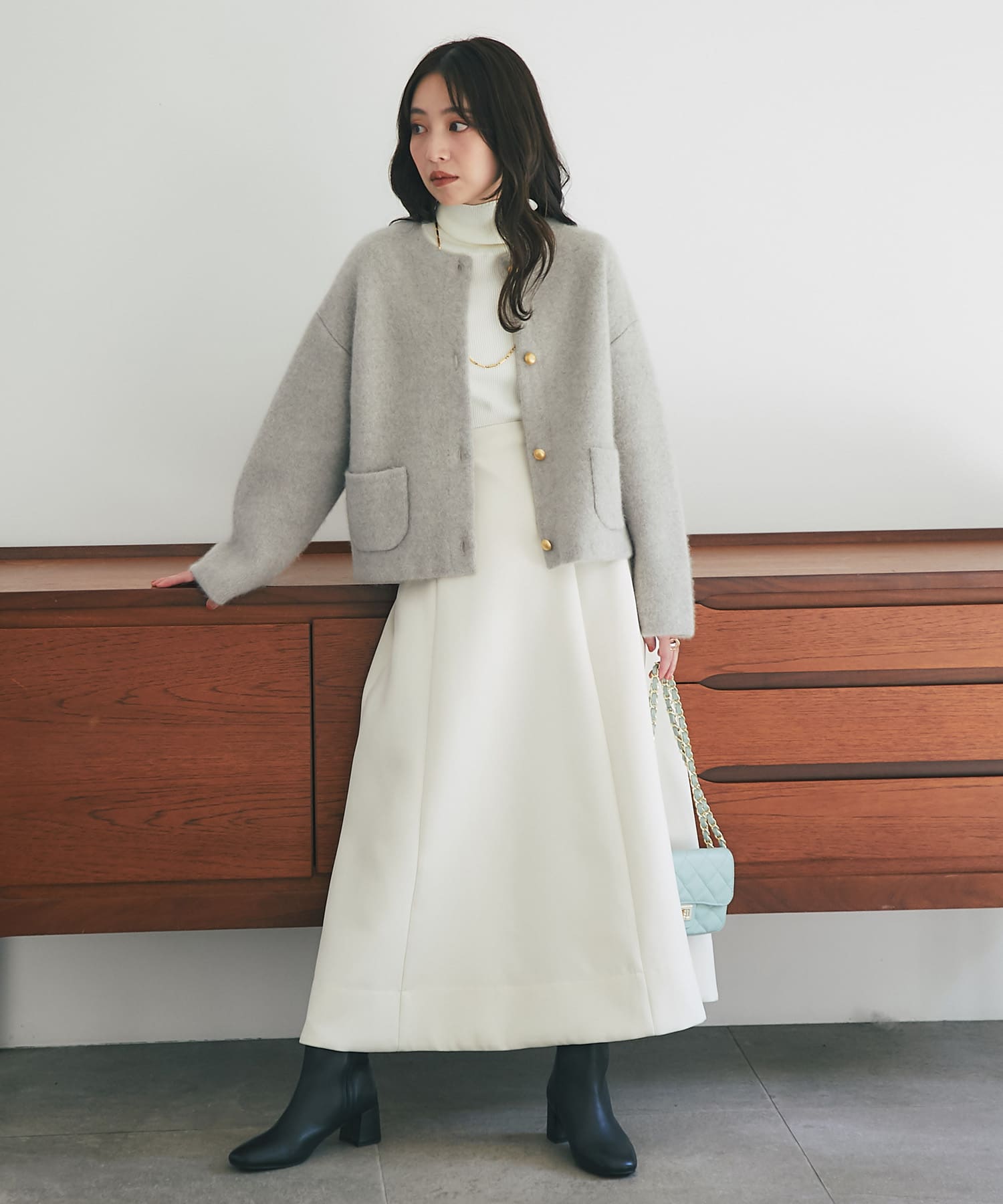 ライトグレーの色が淡くてスカートにもパンツにも合わせやすそうです