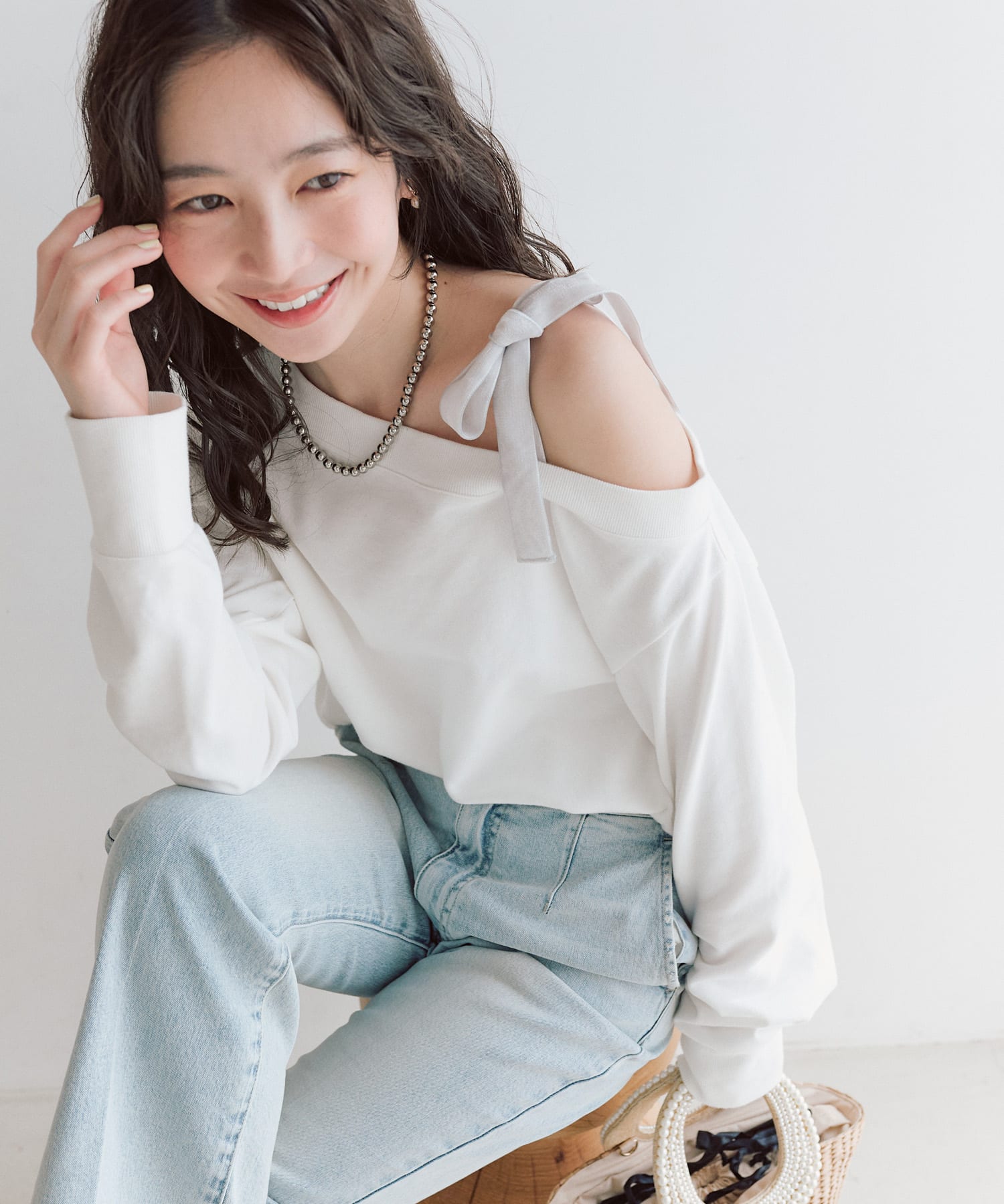 カジュアルな服装に合わせても肩のリボンがポイントになって可愛いです。