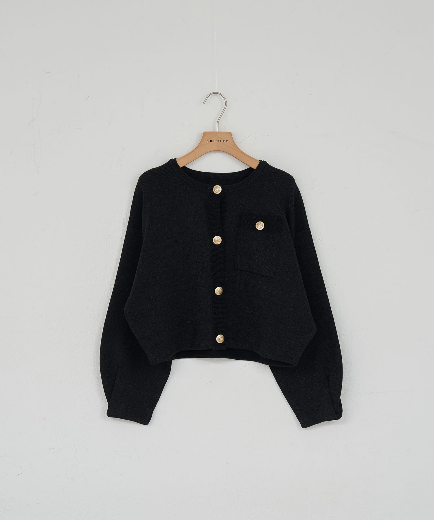 • 07. ラメニットカーディガン Black / Light gray コンパクトでバランスの取りやすいシルエットのカーディガン。