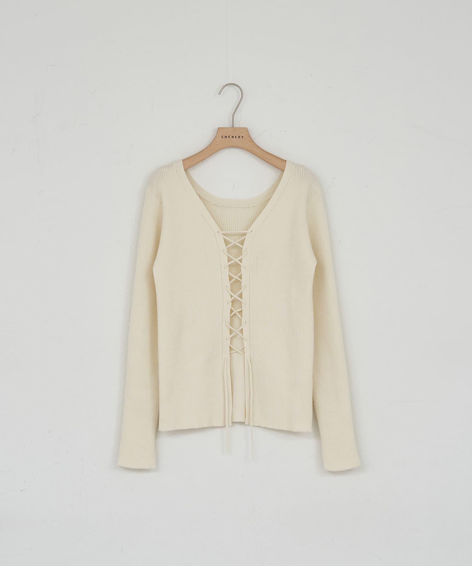 • 08. レースアップニット Off white / Black / Beige フロントにあしらったリボンのレースアップがデザインポイント。