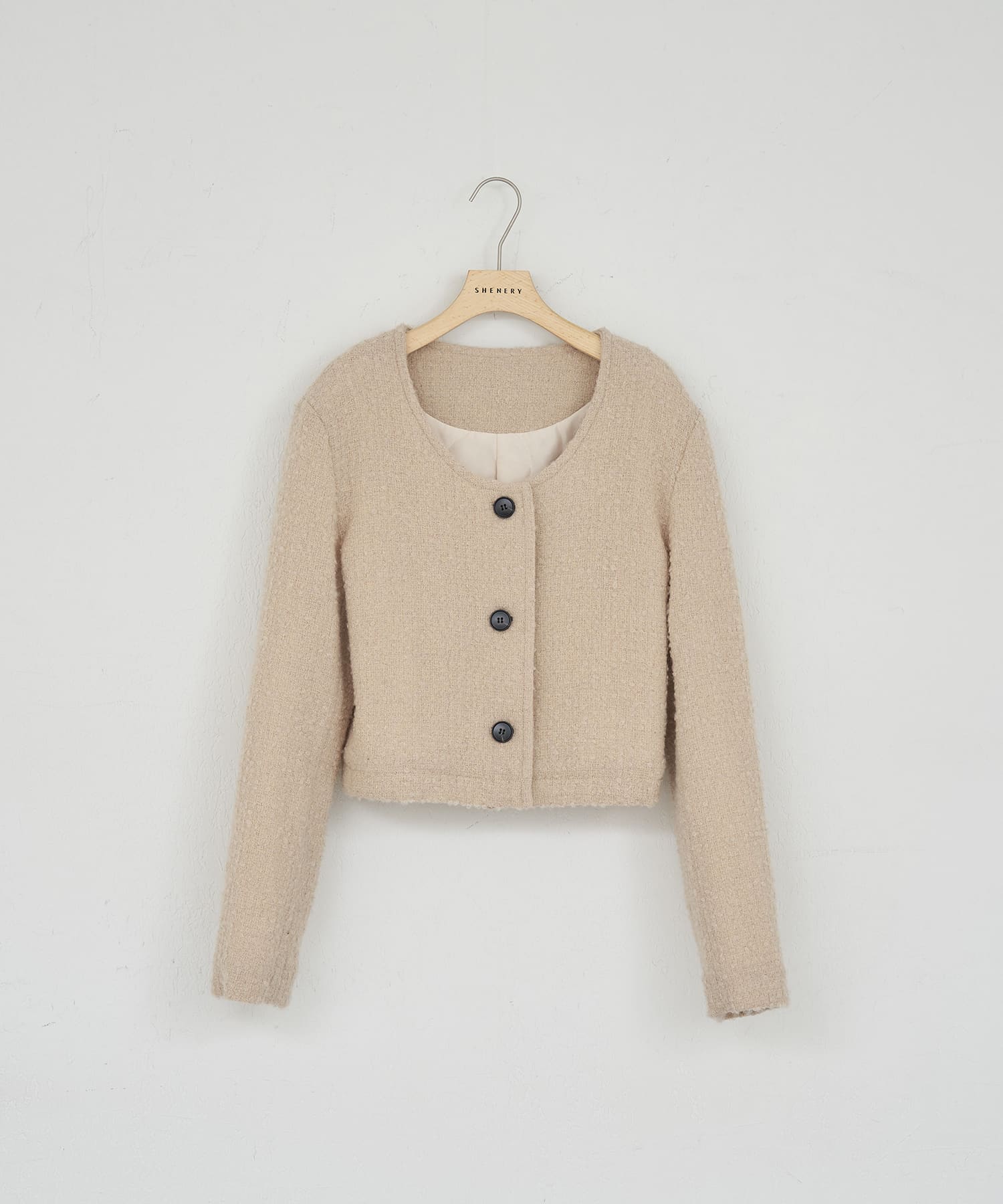 • 10. Uネックショートジャケット Beige / Black 羽織るだけでトラッドな印象にしてくれるジャケット。