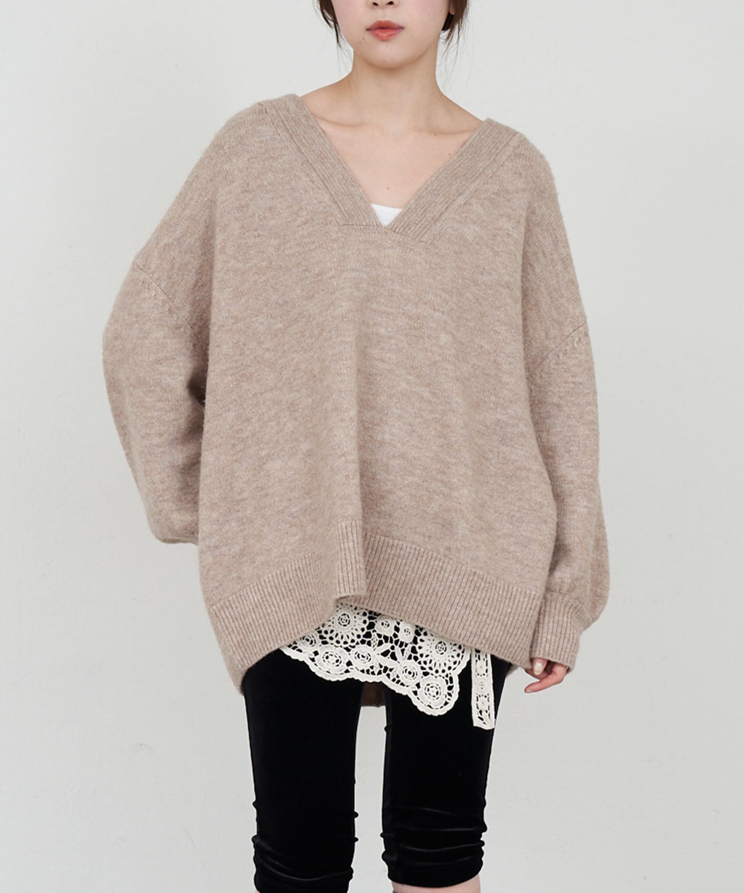 長めのVネックが女性らしい印象に。