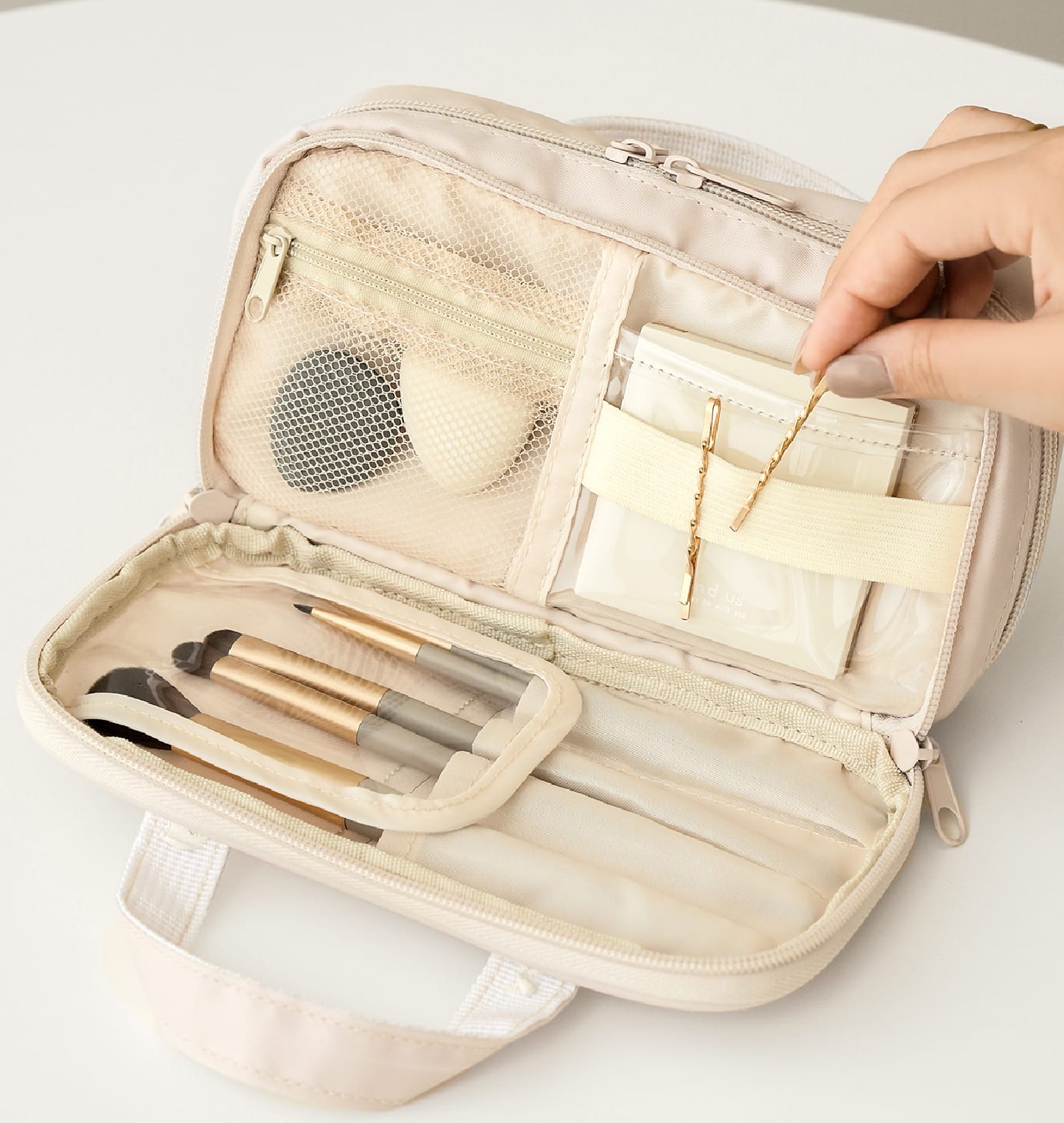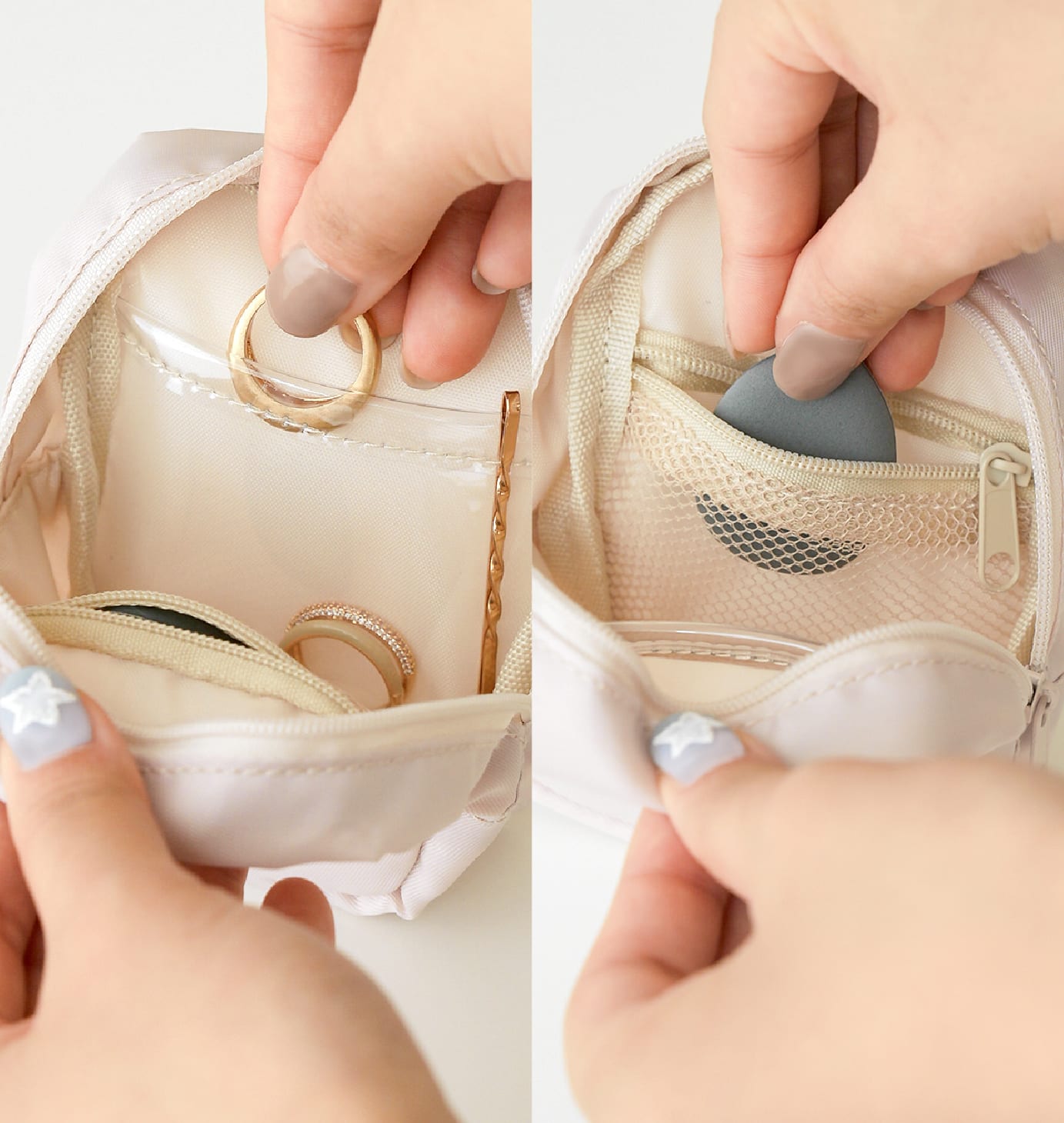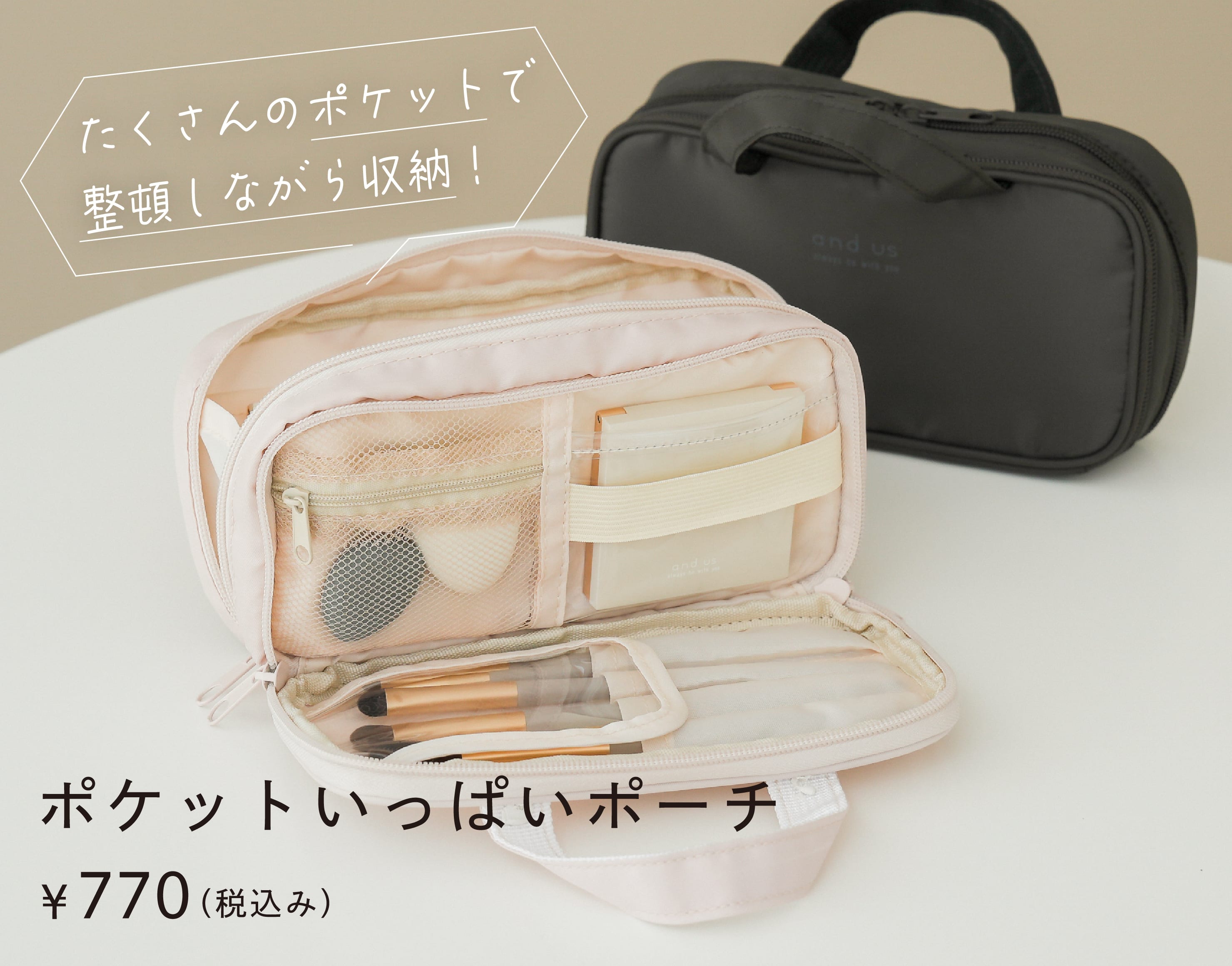 メッシュポーチとクリアポケット付きで、種類ごとに分けて収納できます。