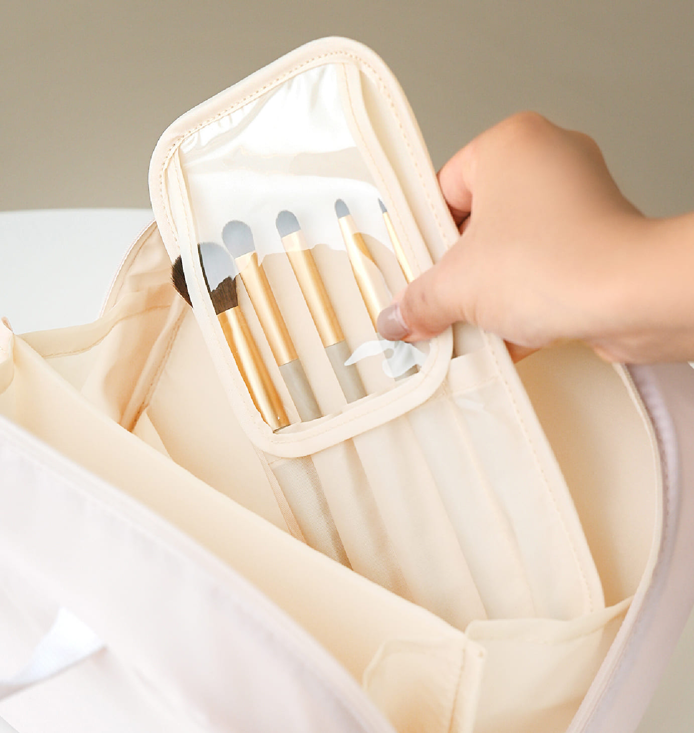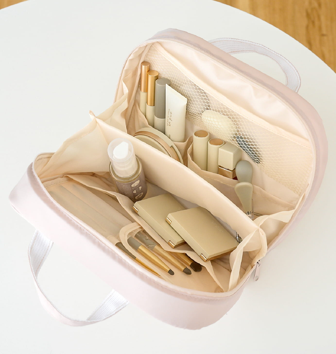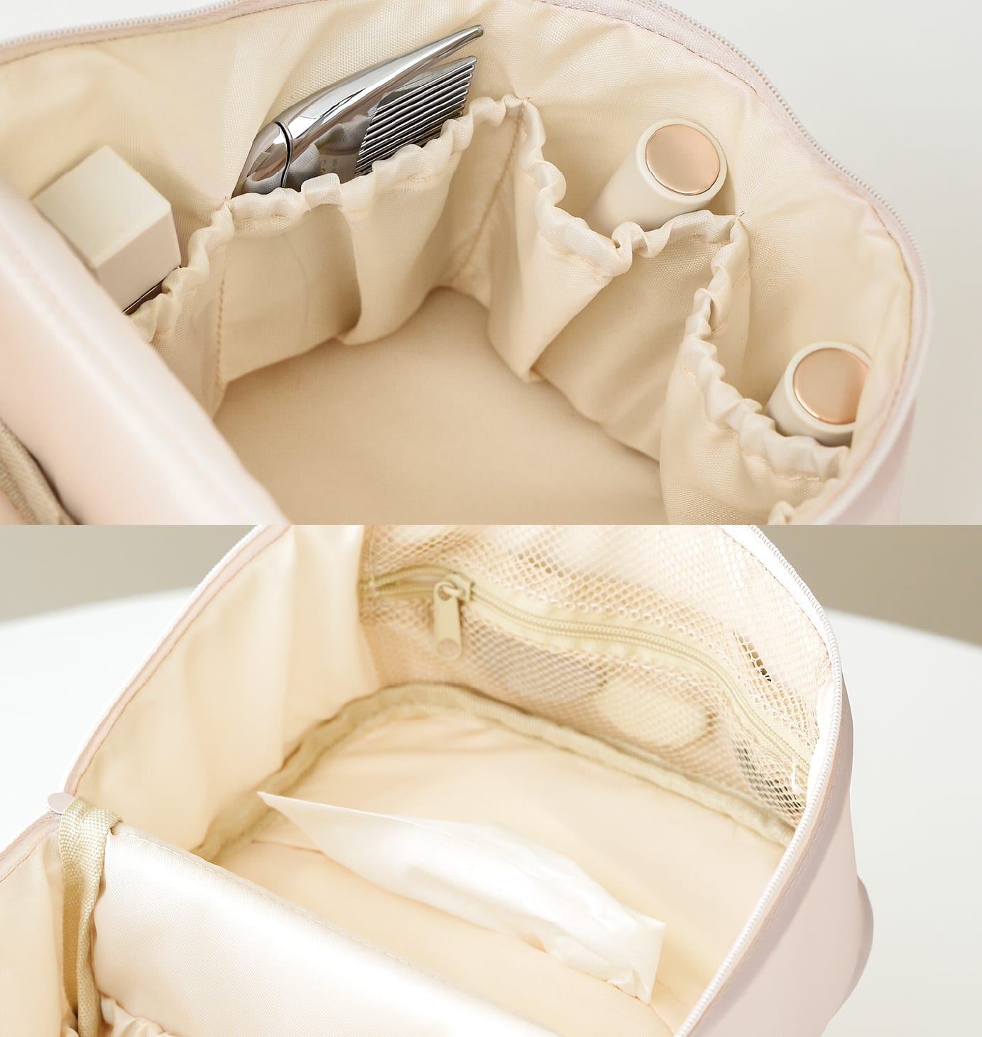 浅め・深め・メッシュなど、細かなコスメを整理して入れられるポケット付き。もう片面はブラシ収納になっており、ブラシやマスカラ、アイライナーをまとめて入れられます。
