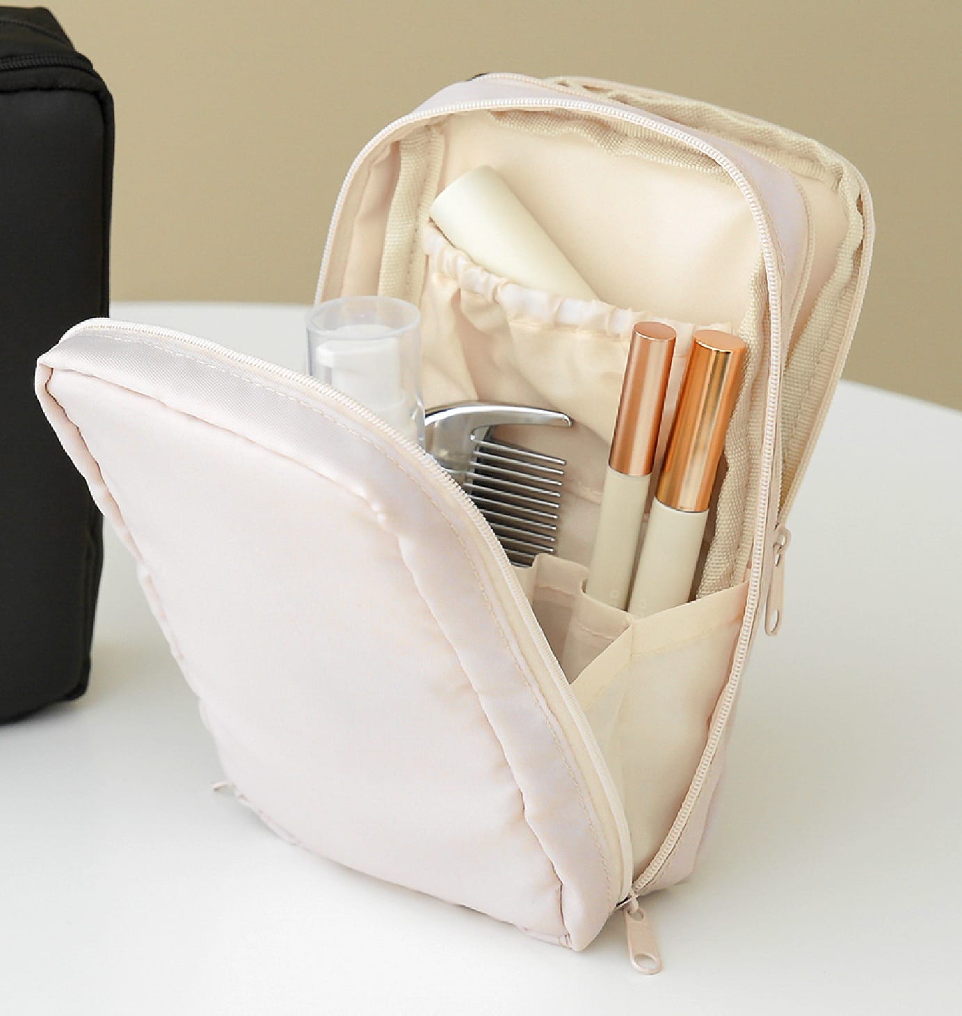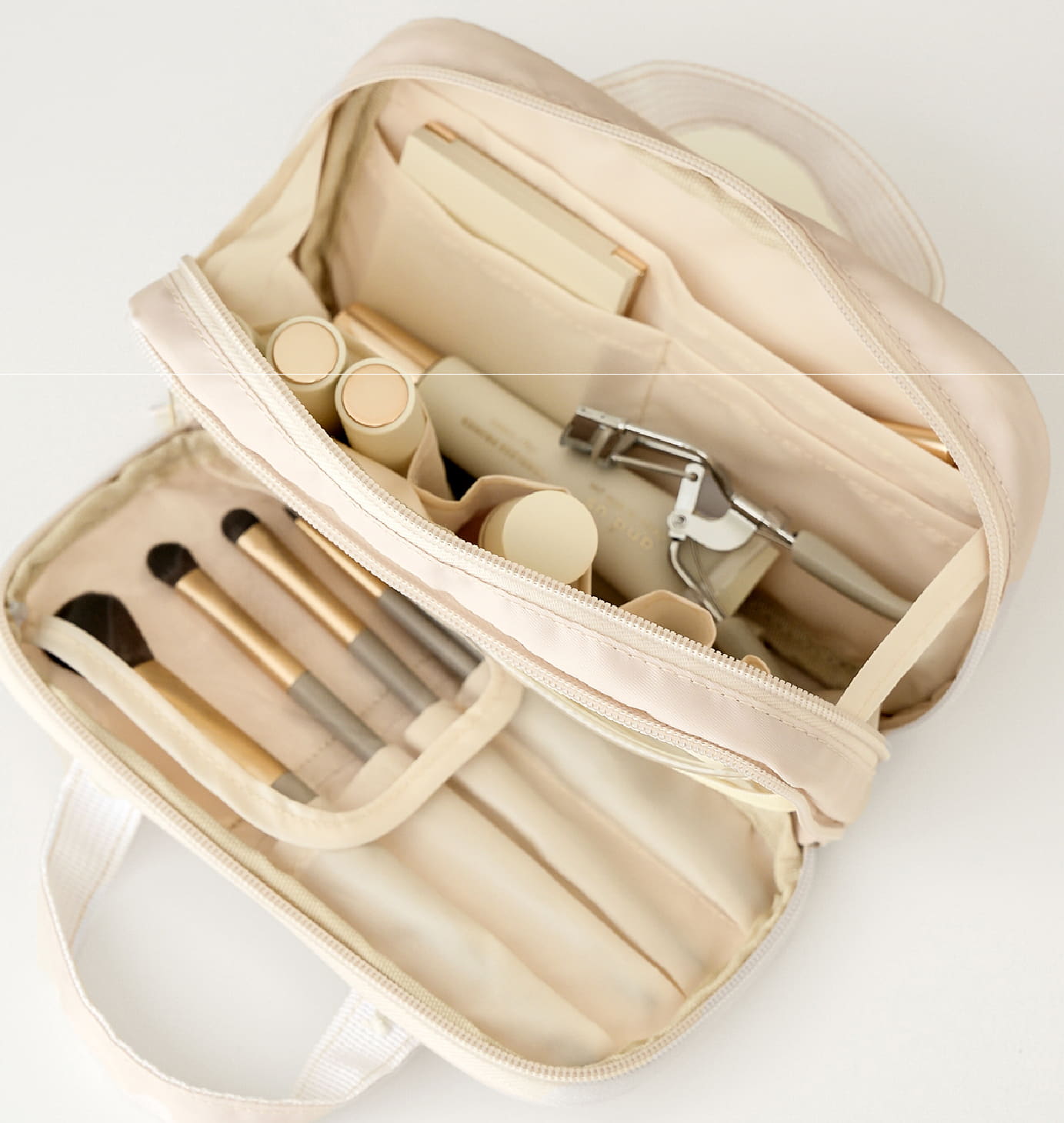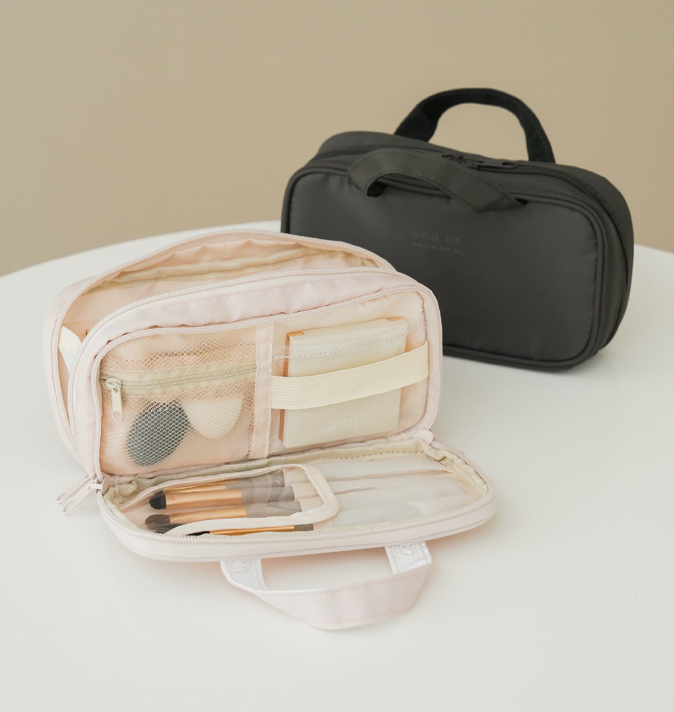 浅め・深め・メッシュなど、細かなコスメを整理して入れられるポケット付き。もう片面はブラシ収納になっており、ブラシやマスカラ、アイライナーをまとめて入れられます。