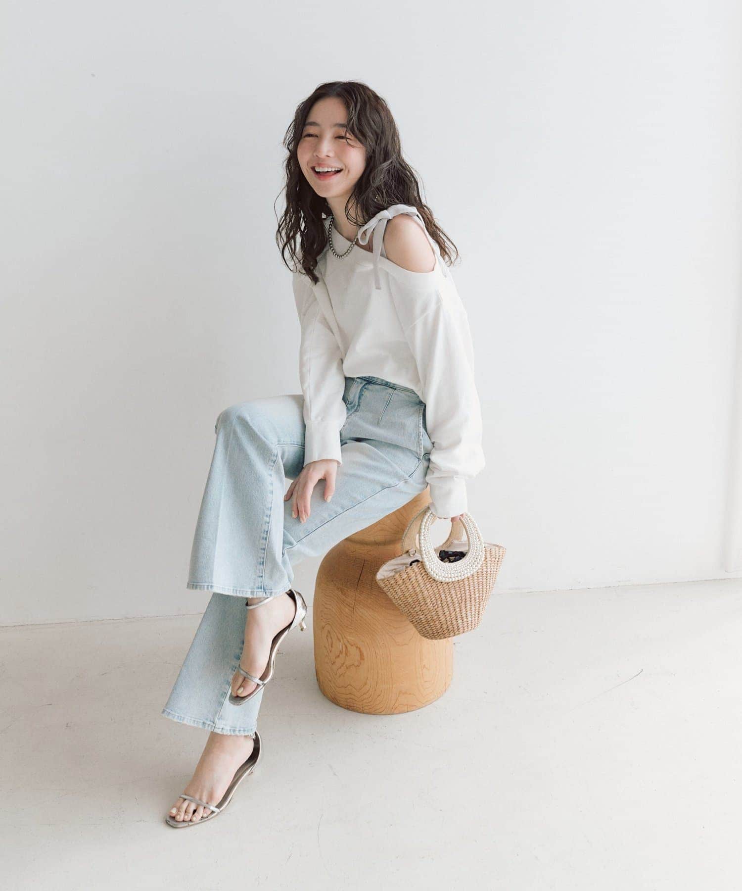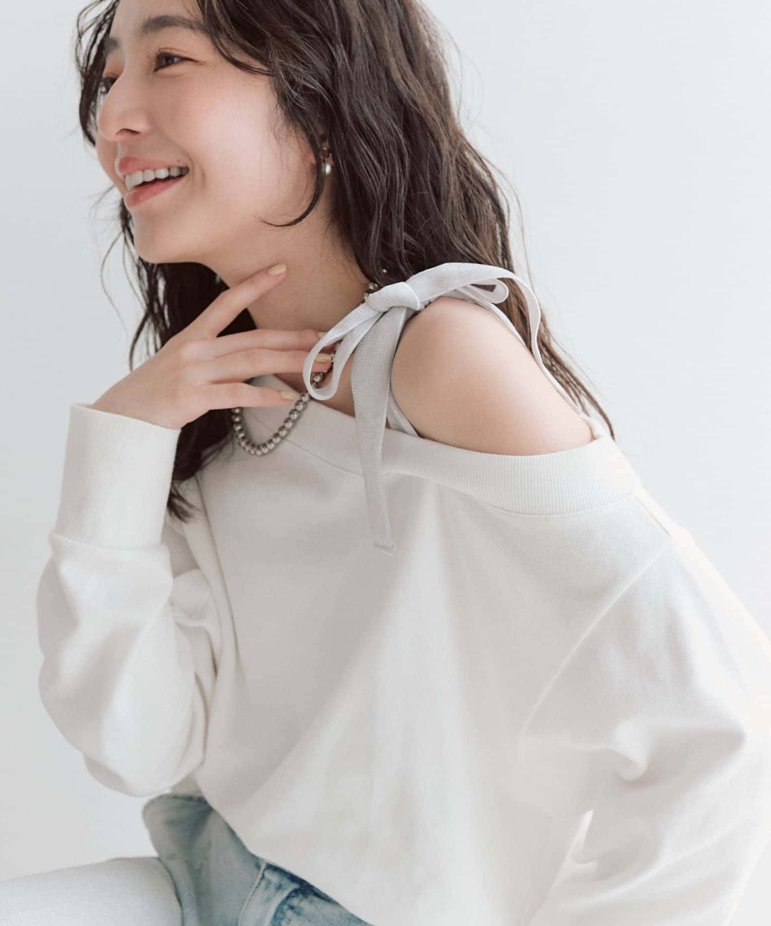 アシメデザインが可愛い、ミニ裏毛のオフショルリボンプルオーバーや、