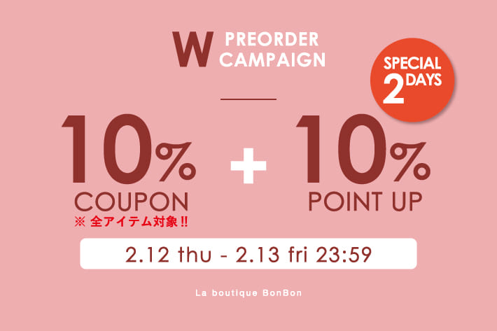 La boutique BonBonでは、本日2/12(木) ~ 2/13(金) 23:59まで、全アイテム対象の10%OFFクーポンキャンペーンを開催いたします!