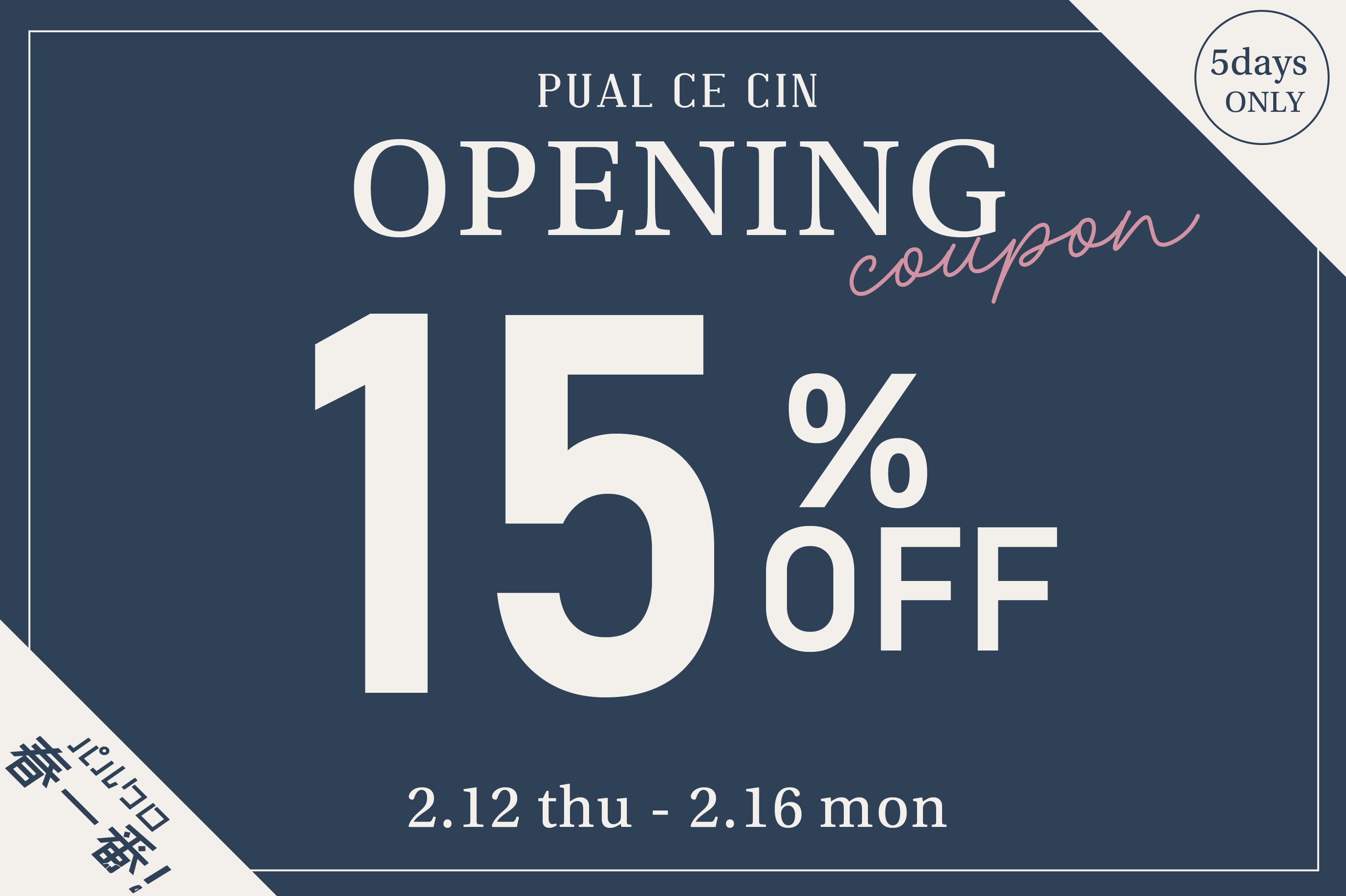 『【PUAL CE CIN】オープニング15%OFFクーポン! 』を選択してご決済ください。