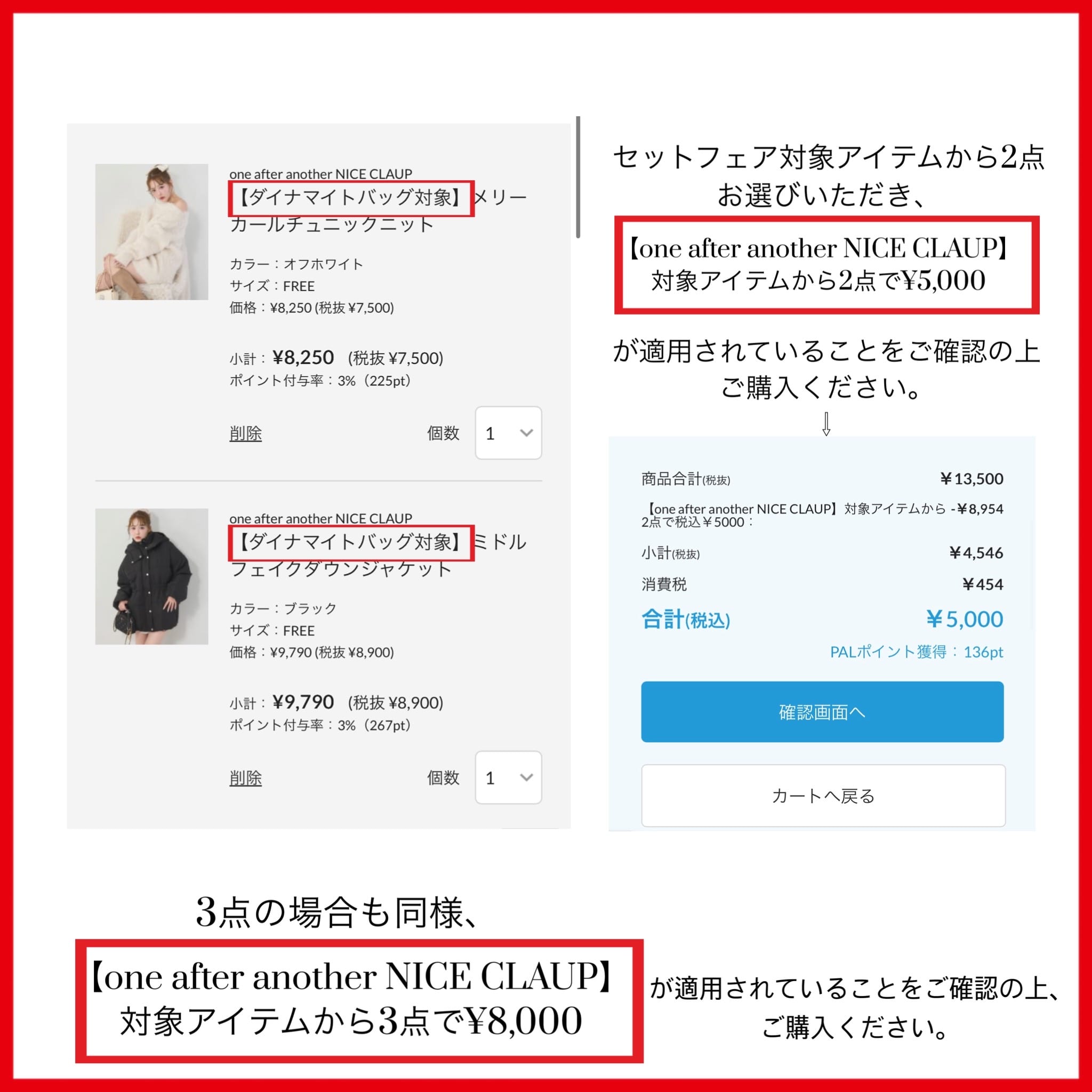 2026.02.19 NEW one after another NICE CLAUP(ワンアフターアナザー ナイスクラップ)【スペシャルダイナマイトバッグ】2点税込み¥5,000、3点税込み¥8,000のセットフェア 対象アイテムおすすめはこちら ▼ご紹介アイテムはこちら▼ one after another NICE CLAUP ビジューシャギーニット ¥6,930 one after another NICE CLAUP オフショルラメニット ¥6,600 one after another NICE CLAUP 【セットアップ可能】ビッグシルエットパーカー ¥7,920 one after another NICE CLAUP 配色カーディガン ¥5,940 one after another NICE CLAUP アイレットプチハイネックニット ¥5,940 手洗い可 one after another NICE CLAUP ロゴアソートニット ¥6,930 one after another NICE CLAUP ロゴファースエット ¥6,930 one after another NICE CLAUP ブローチ付きベロアモールミニニットワンピース ¥9,350 動画 one after another NICE CLAUP パール×ビジューオフショルニット ¥7,150 手洗い可 one after another NICE CLAUP 【セットアップ可能】カットミニスカート ¥6,930 手洗い可 one after another NICE CLAUP ベル袖リブカーデ ¥4,400 手洗い可 one after another NICE CLAUP バックリボンアメスリブラウス ¥6,930 2026.02.15 NEW one after another NICE CLAUP 【Xで話題の】サイドレースデニム徹底解説 2026.02.14 one after another NICE CLAUP SNSで話題のマイナス3キロ見えトリプルソールスニーカー徹底解説♡ 2026.02.12 one after another NICE CLAUP YouTube更新/春ワンピ6コーデ🌸推し活・デート・着痩せ全部叶う新作LOOKBOOK 2026.02.12 one after another NICE CLAUP 《パルクロ春一番》アンコールタイムセール開催! 2026.02.12 one after another NICE CLAUP 買う・見つける・貯める春。『2026 パルクロ春一番』開催! 2026.02.06 one after another NICE CLAUP 【LouLoumei】再販の声多数のLouLoumei初代推し活トートバック 2026.02.06 one after another NICE CLAUP 【5日間限定】omiyu企画予約15%OFFクーポン 2026.02.06 one after another NICE CLAUP 【5日間限定】ayano企画予約15%OFFクーポン ニュース一覧へ > ニュース一覧へ >