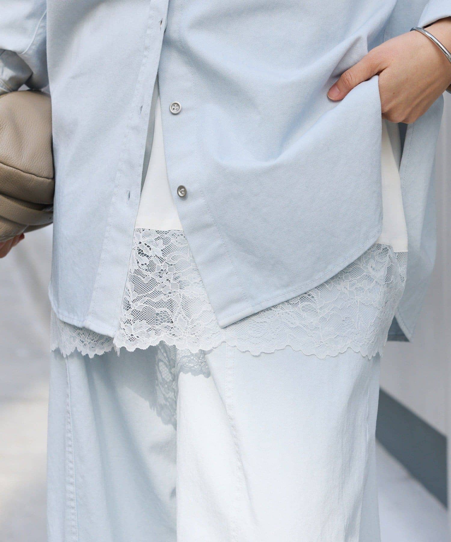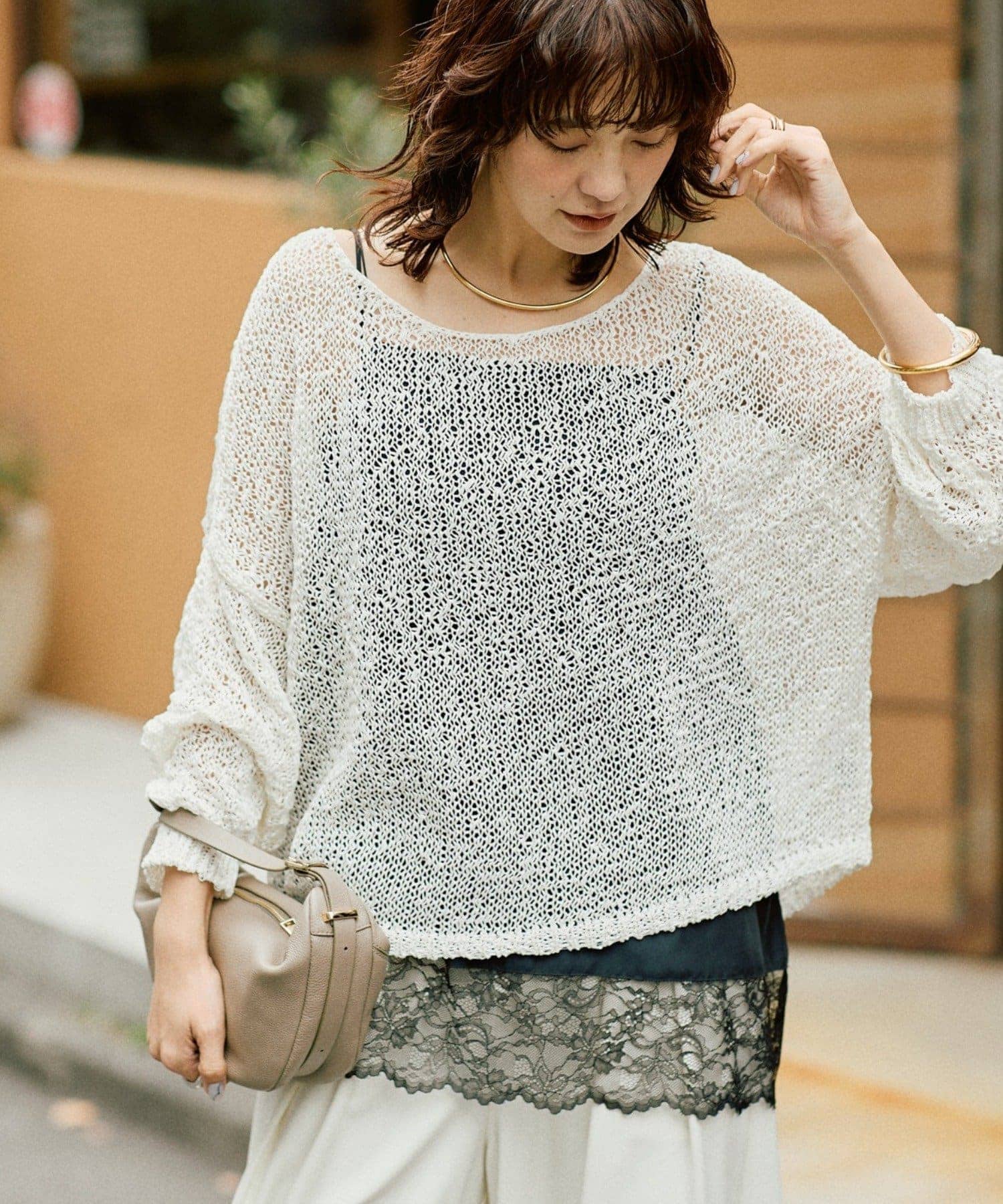 斜めになったヘムラインとレースのあしらいがトレンド感たっぷりのキャミソール