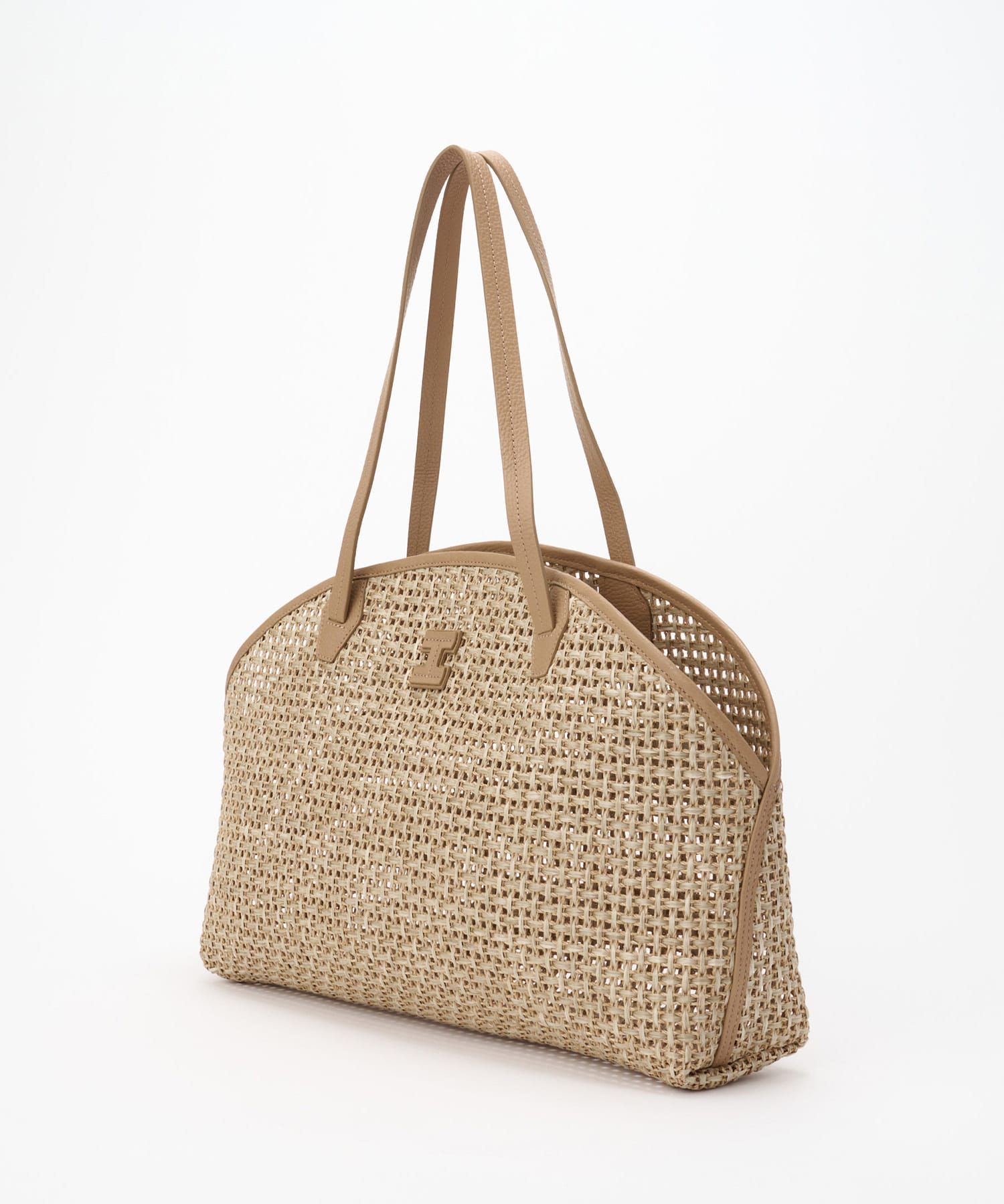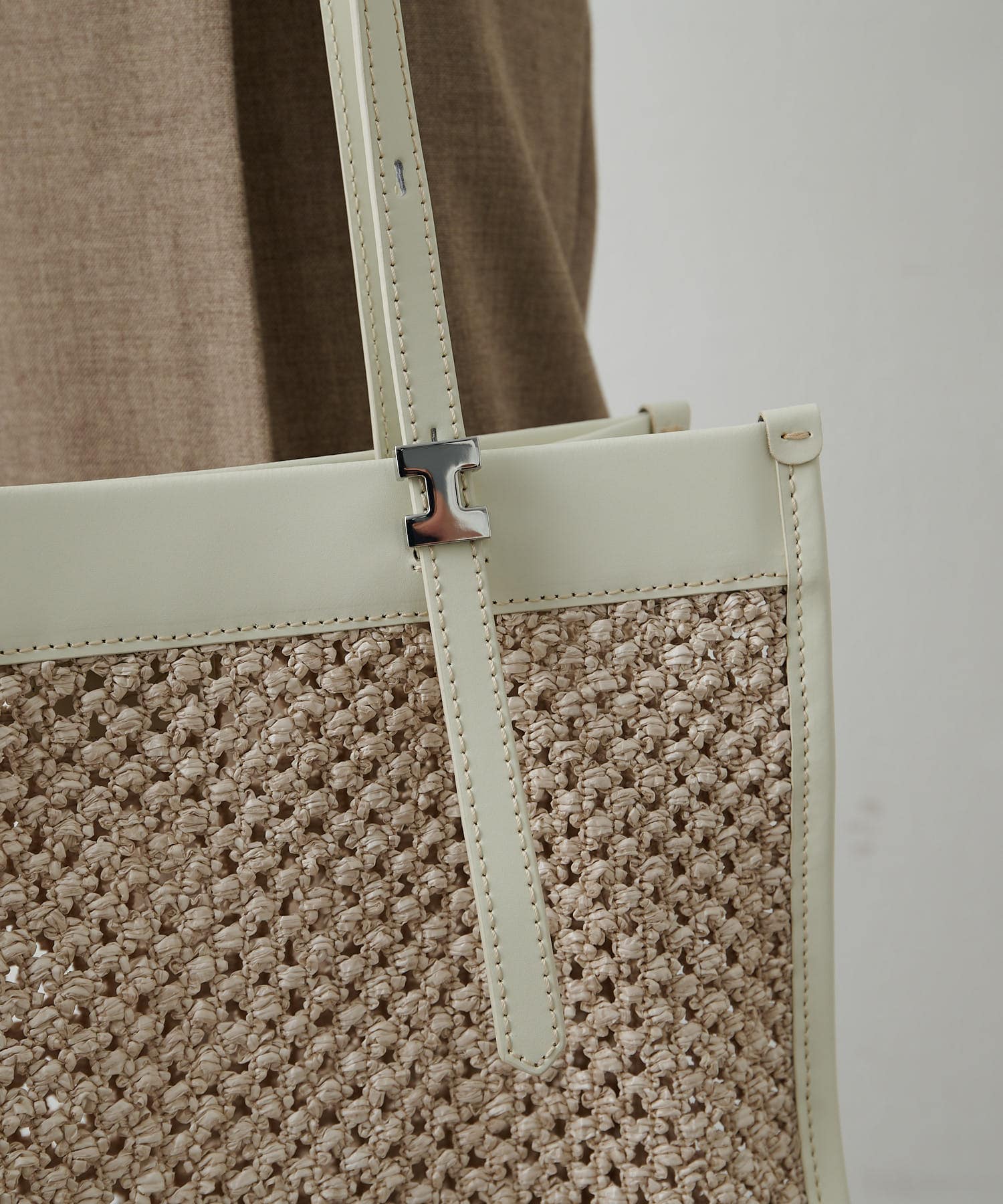 今季初登場の、3素材の中でも一番ラグジュアリー感たっぷりの「PAGLIA CATENA」。丁寧に鎖状に編まれ、ハリがあるのが特徴。柔らかなベージュの濃淡ある2カラーで編み込むことで、ラフなテイストのなかに上品さも感じられる素材です。目が大きく透け感があるので、あえて見える収納はもちろん、不安な方はバッグインバッグ収納や、スカーフをかけたりとアレンジを楽しむのがおすすめ。