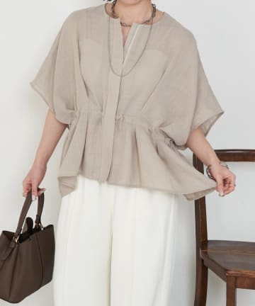 カジュアルな素材ながら、バックギャザーによって女性らしい印象で着こなせます。