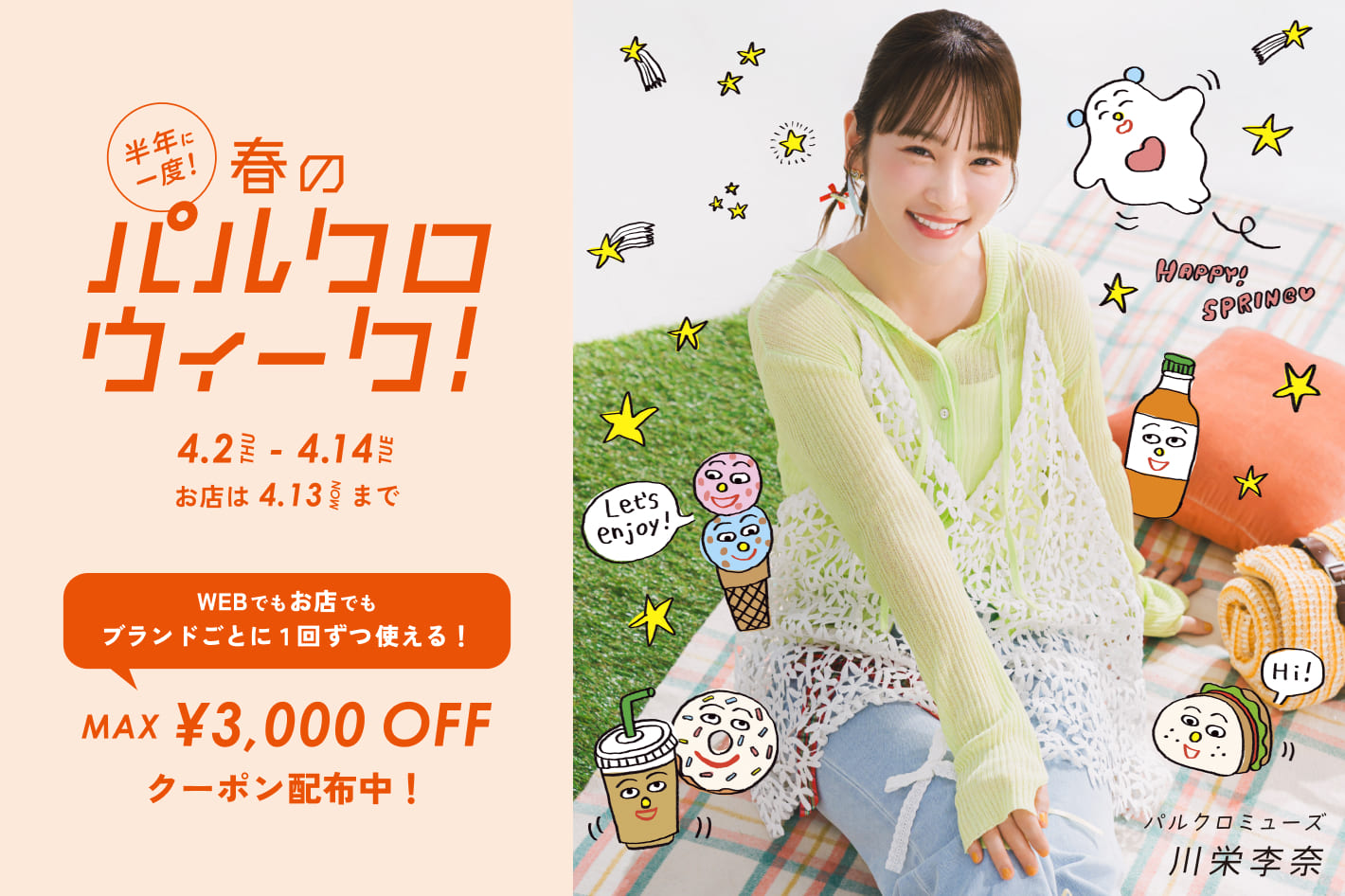 期間中、パルグループの店舗とパルクローゼットオンラインストアにて、ブランドごとに1回ずつ使える最大3,000円のお得なクーポンを配布!また、パルクローゼット限定でタイムセールも同時開催します。