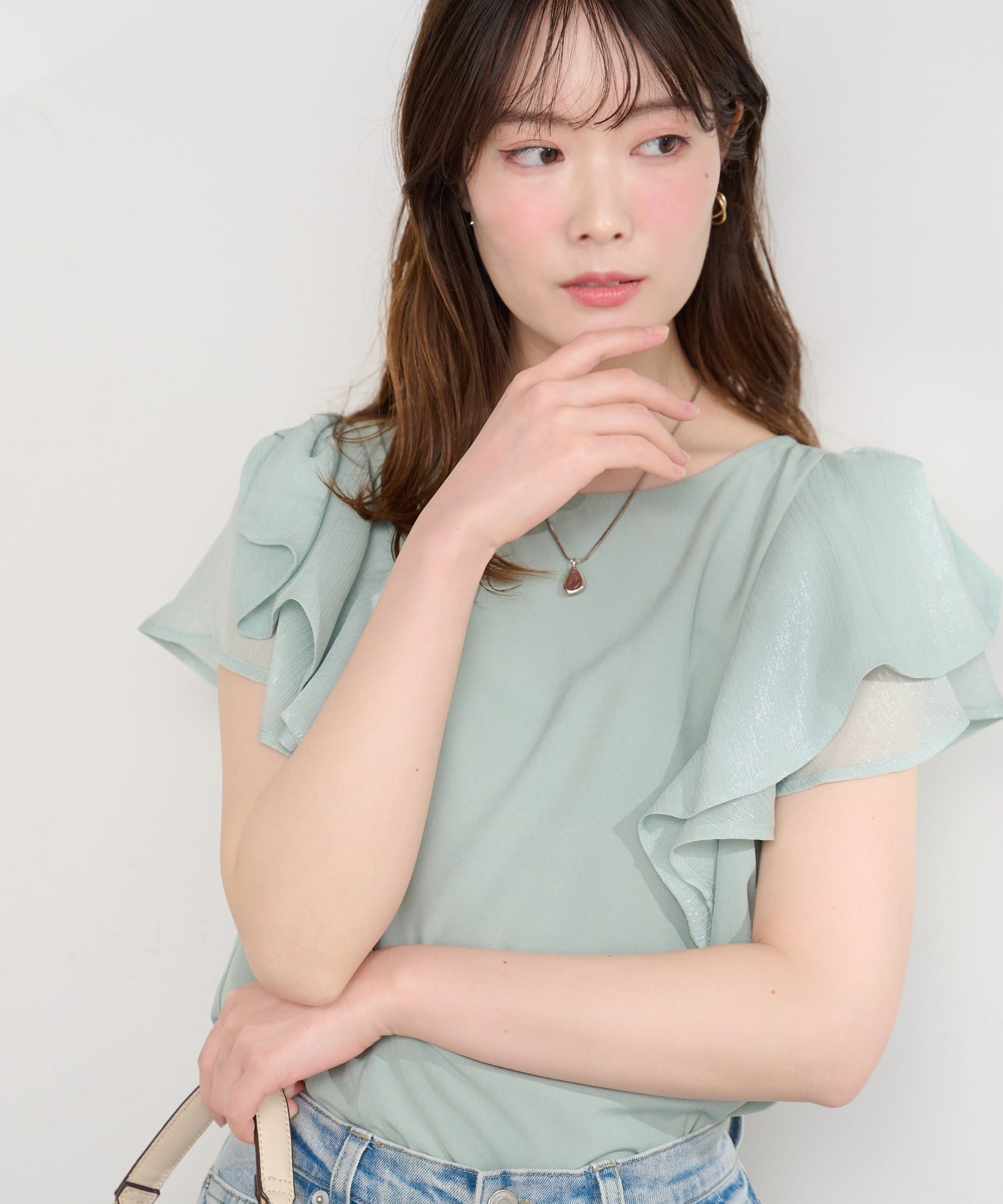 肩リボンラッフルフレア袖ブラウス
