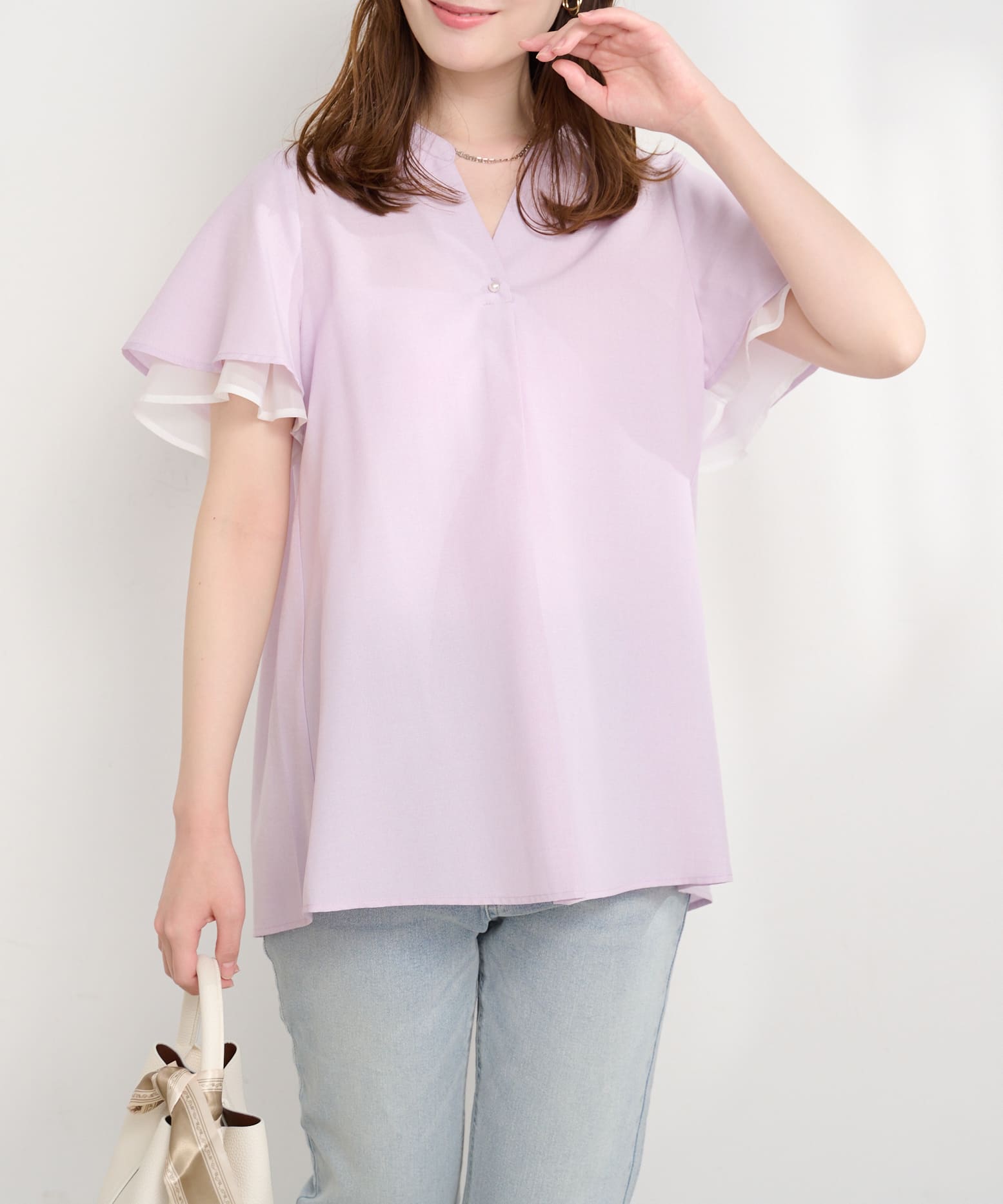 袖口シアーパール釦スキッパーブラウス