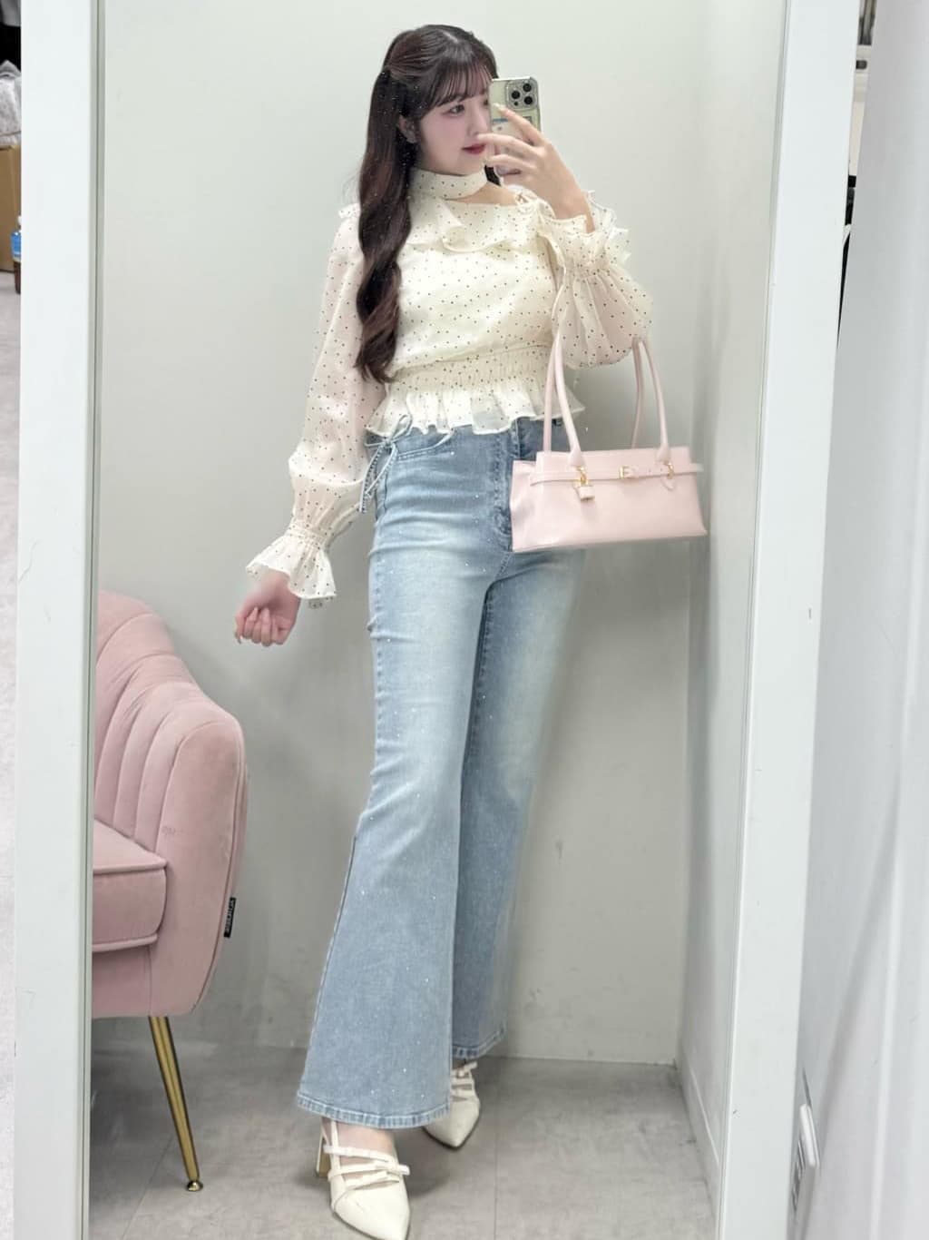 スニーカーは厚底で盛れるデザインで、23.5cmだとMがピッタリでした!ビジューもついてて可愛い系のコーデでもカジュアルでもどっちにも使えます◎