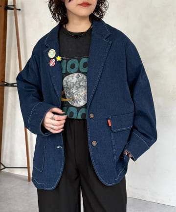 缶バッジ付きデニムテーラードジャケット