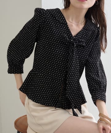 Wボタンギャザーブラウス(ドット柄・無地)