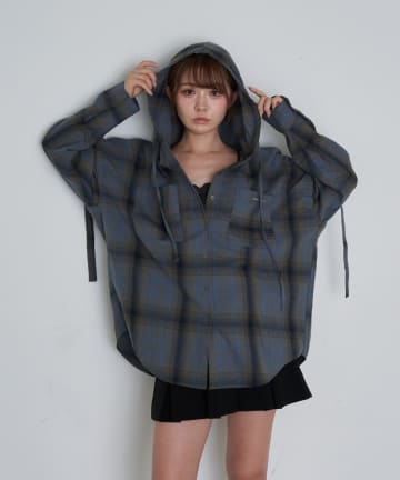 袖スリットフードチェックシャツ