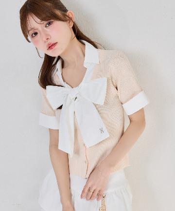 【リボン取り外し可能】リボンシャツドッキングニット